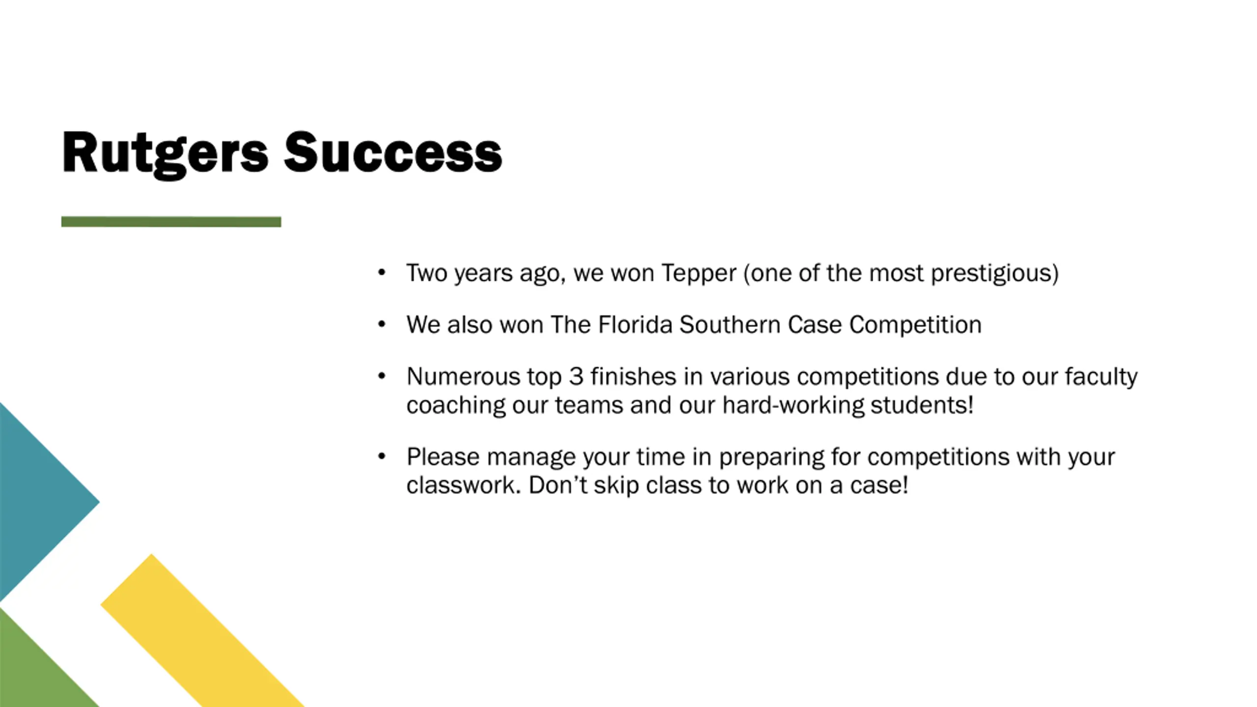 Rutgers Success Rutgers Success Two years ago, we won Tepper (one of the most prestigious) We also won The Florida Southern Case Competition Numerous top 3 finishes in various competitions due to our faculty coaching our teams and our hard-working students! Please manage your time in preparing for competitions with your classwork. Don t skip class to work on a case!