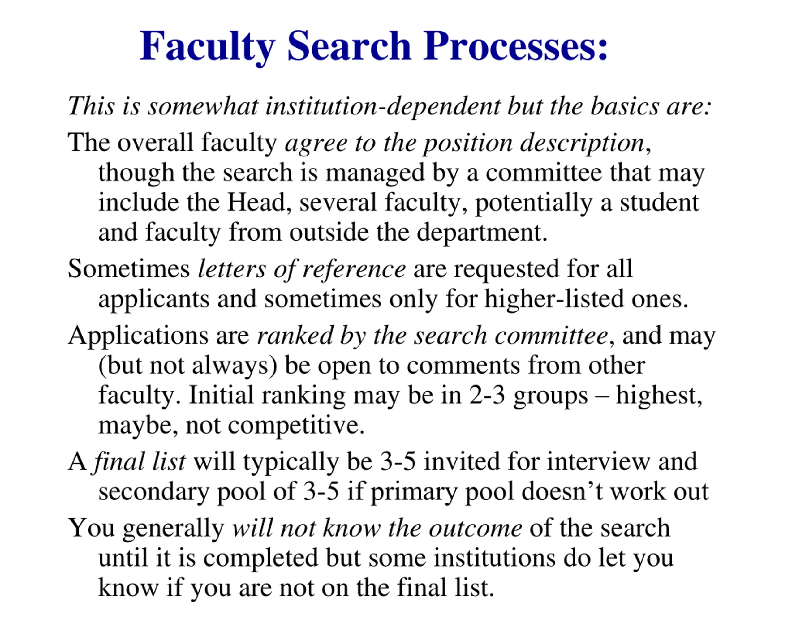 Faculty Search Processes: This is somewhat institution-dependent but the basics are: The overall faculty agree to the position description, though the search is managed by a committee that may include the Head, several faculty, potentially a student and faculty from outside the department. Sometimes letters of reference are requested for all applicants and sometimes only for higher-listed ones. Applications are ranked by the search committee, and may (but not always) be open to comments from other faculty. Initial ranking may be in 2-3 groups highest, maybe, not competitive. A final list will typically be 3-5 invited for interview and secondary pool of 3-5 if primary pool doesn t work out You generally will not know the outcome of the search until it is completed but some institutions do let you know if you are not on the final list.