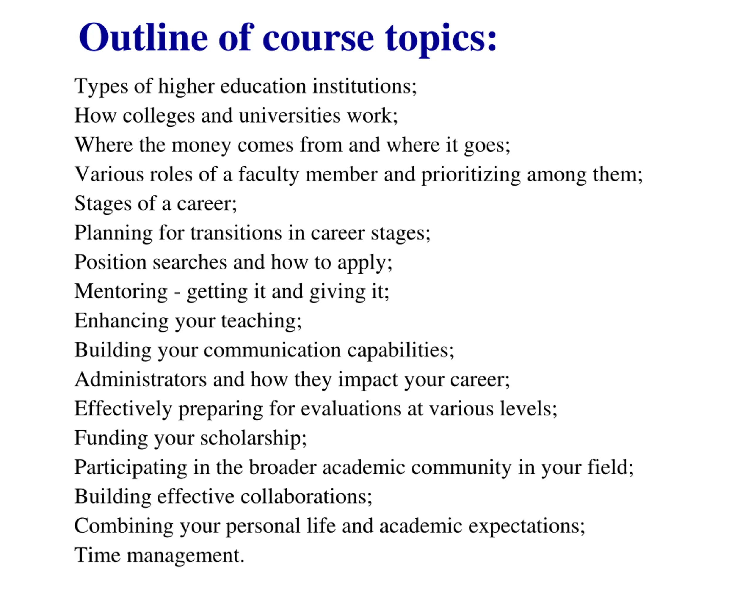 Outline of course topics: Types of higher education institutions; How colleges and universities work; Where the money comes from and where it goes; Various roles of a faculty member and prioritizing among them; Stages of a career; Planning for transitions in career stages; Position searches and how to apply; Mentoring - getting it and giving it; Enhancing your teaching; Building your communication capabilities; Administrators and how they impact your career; Effectively preparing for evaluations at various levels; Funding your scholarship; Participating in the broader academic community in your field; Building effective collaborations; Combining your personal life and academic expectations; Time management.