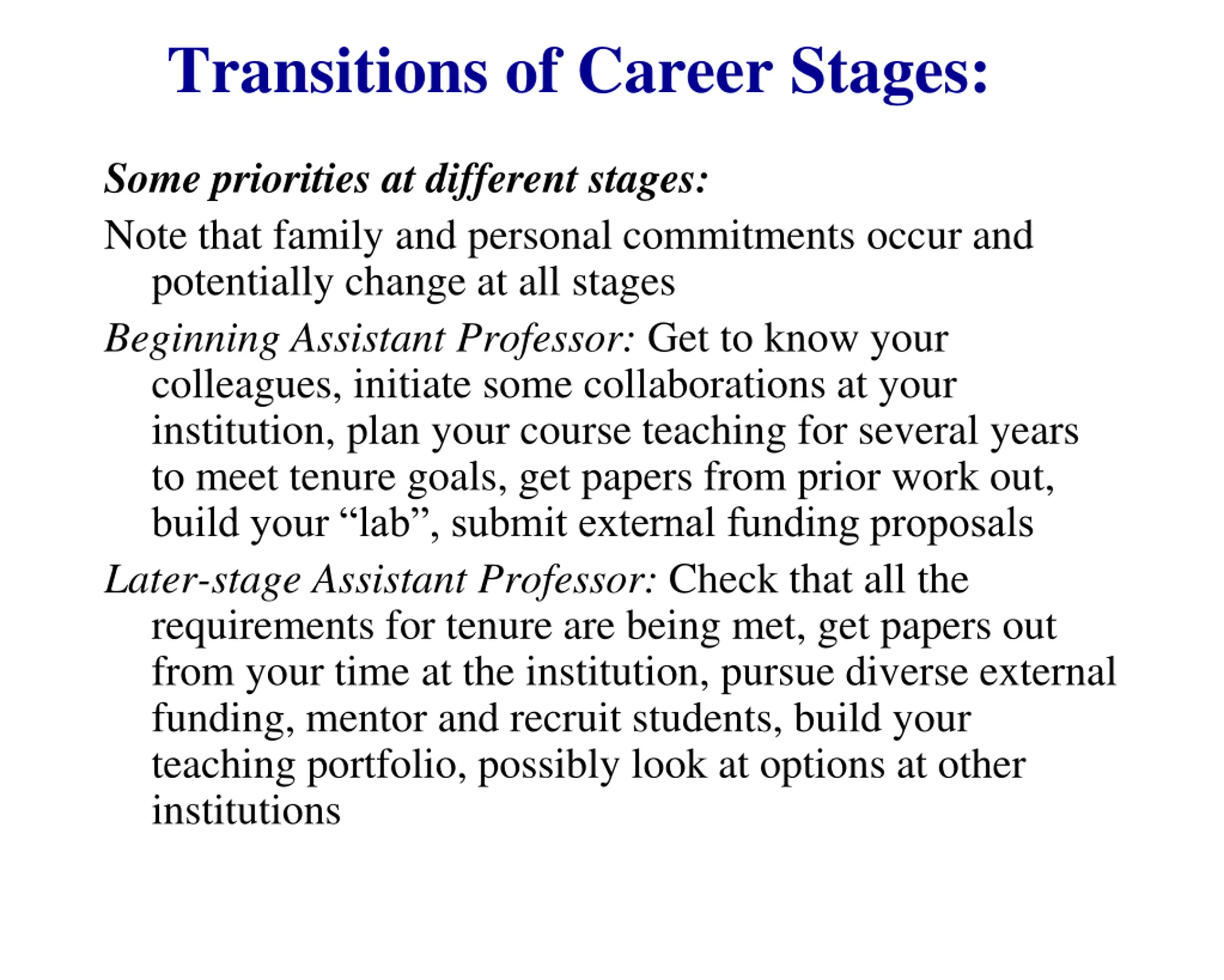 Transitions of Career Stages: Some priorities at different stages: Note that family and personal commitments occur and potentially change at all stages Beginning Assistant Professor: Get to know your colleagues, initiate some collaborations at your institution, plan your course teaching for several years to meet tenure goals, get papers from prior work out, build your lab , submit external funding proposals Later-stage Assistant Professor: Check that all the requirements for tenure are being met, get papers out from your time at the institution, pursue diverse external funding, mentor and recruit students, build your teaching portfolio, possibly look at options at other institutions