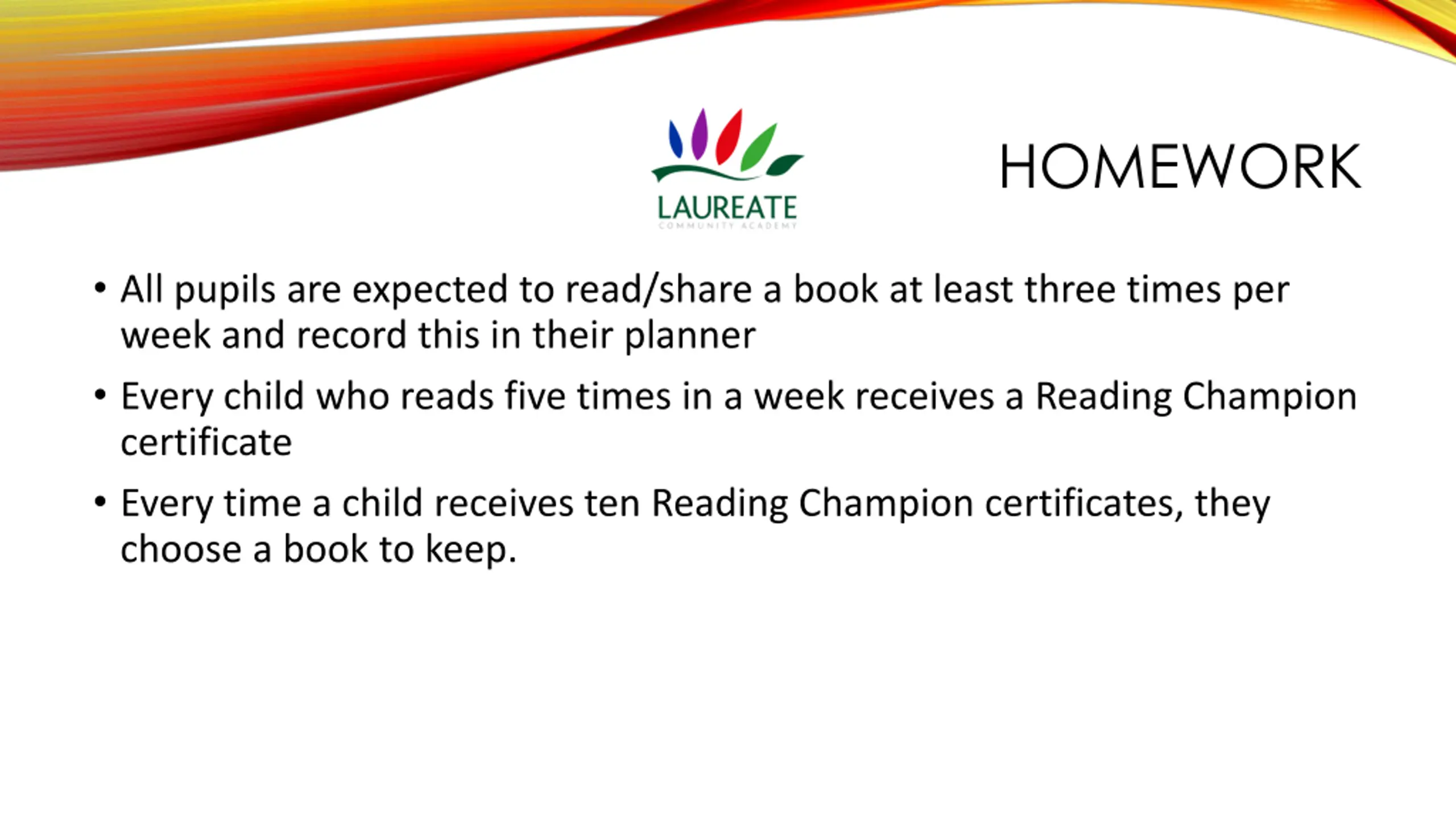HOMEWORK All pupils are expected to read/share a book at least three times per week and record this in their planner Every child who reads five times in a week receives a Reading Champion certificate Every time a child receives ten Reading Champion certificates, they choose a book to keep.