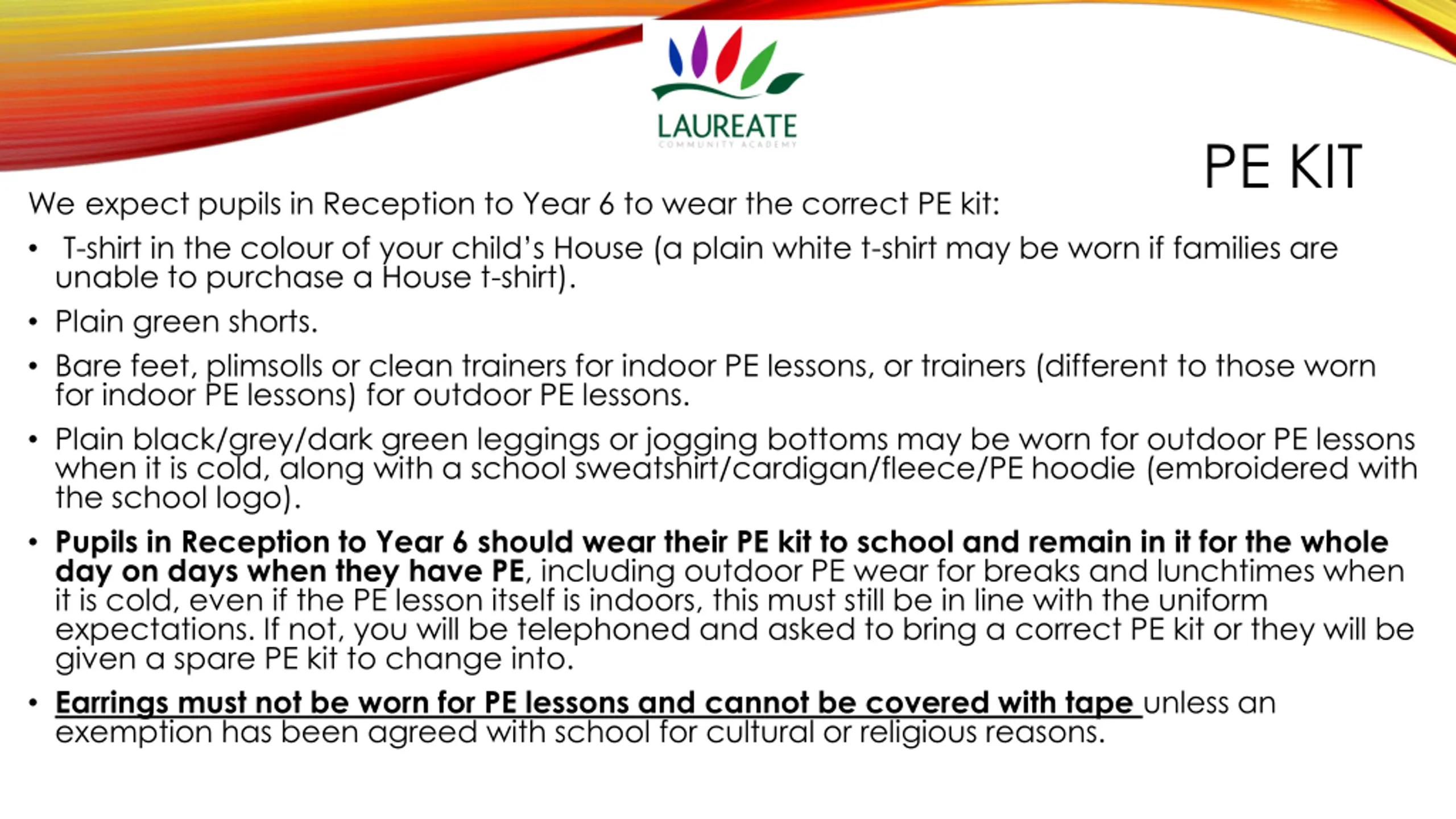 PE KIT We expect pupils in Reception to Year 6 to wear the correct PE kit: T-shirt in the colour of your child s House (a plain white t-shirt may be worn if families are unable to purchase a House t-shirt). Plain green shorts. Bare feet, plimsolls or clean trainers for indoor PE lessons, or trainers (different to those worn for indoor PE lessons) for outdoor PE lessons. Plain black/grey/dark green leggings or jogging bottoms may be worn for outdoor PE lessons when it is cold, along with a school sweatshirt/cardigan/fleece/PE hoodie (embroidered with the school logo). Pupils in Reception to Year 6 should wear their PE kit to school and remain in it for the whole day on days when they have PE, including outdoor PE wear for breaks and lunchtimes when it is cold, even if the PE lesson itself is indoors, this must still be in line with the uniform expectations. If not, you will be telephoned and asked to bring a correct PE kit or they will be given a spare PE kit to change into. Earrings must not be worn for PE lessons and cannot be covered with tape unless an exemption has been agreed with school for cultural or religious reasons.