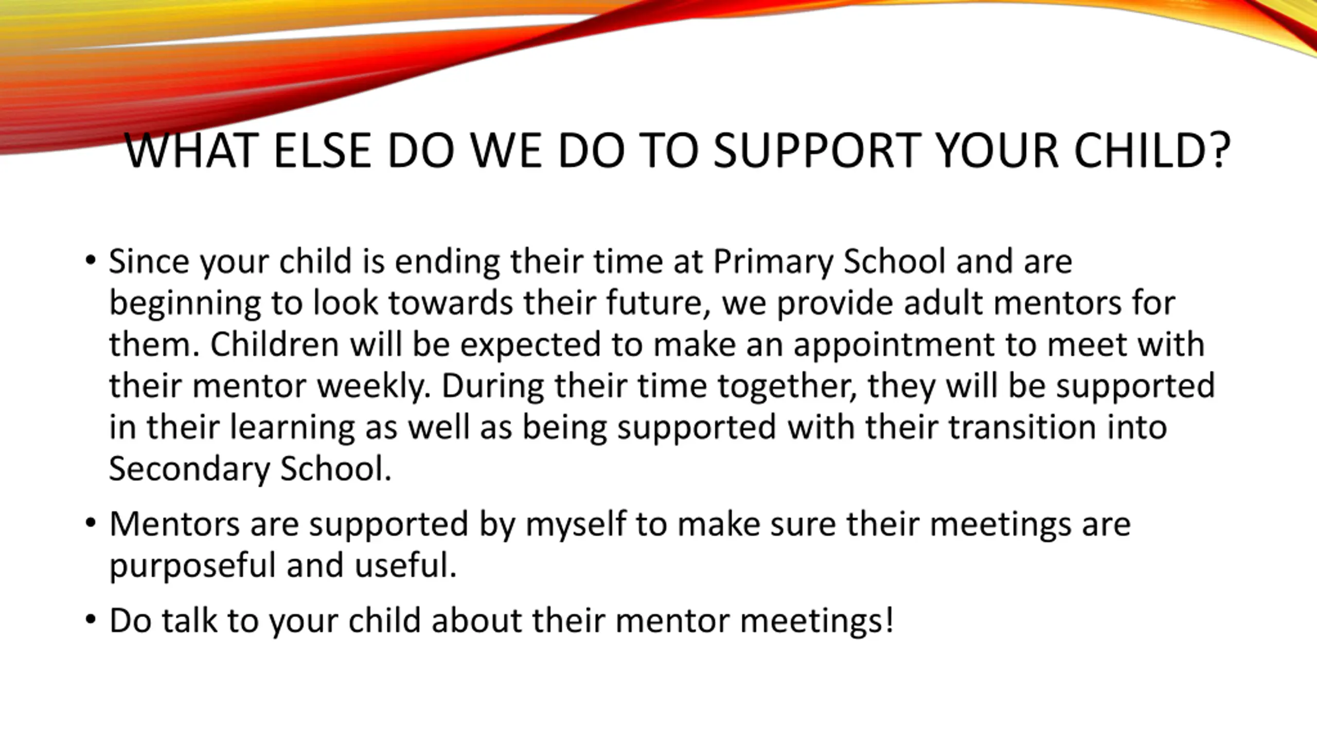 WHAT ELSE DO WE DO TO SUPPORT YOUR CHILD? Since your child is ending their time at Primary School and are beginning to look towards their future, we provide adult mentors for them. Children will be expected to make an appointment to meet with their mentor weekly. During their time together, they will be supported in their learning as well as being supported with their transition into Secondary School. Mentors are supported by myself to make sure their meetings are purposeful and useful. Do talk to your child about their mentor meetings!