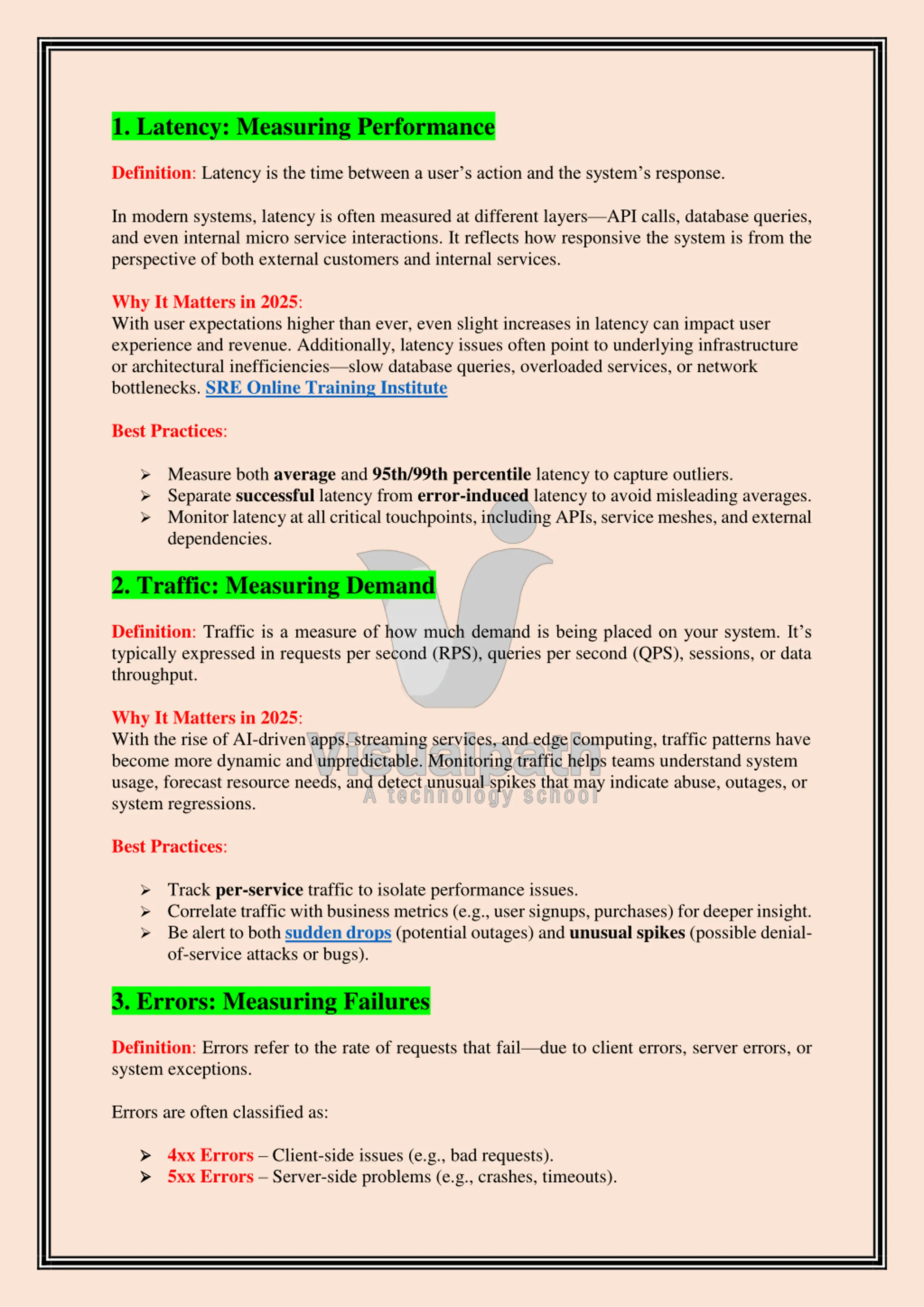 1. Latency: Measuring Performance Definition: Latency is the time between a user s action and the system s response. In modern systems, latency is often measured at different layers API calls, database queries, and even internal micro service interactions. It reflects how responsive the system is from the perspective of both external customers and internal services. Why It Matters in 2025: With user expectations higher than ever, even slight increases in latency can impact user experience and revenue. Additionally, latency issues often point to underlying infrastructure or architectural inefficiencies slow database queries, overloaded services, or network bottlenecks. SRE Online Training Institute Best Practices: Measure both average and 95th/99th percentile latency to capture outliers. Separate successful latency from error-induced latency to avoid misleading averages. Monitor latency at all critical touchpoints, including APIs, service meshes, and external dependencies. 2. Traffic: Measuring Demand Definition: Traffic is a measure of how much demand is being placed on your system. It s typically expressed in requests per second (RPS), queries per second (QPS), sessions, or data throughput. Why It Matters in 2025: With the rise of AI-driven apps, streaming services, and edge computing, traffic patterns have become more dynamic and unpredictable. Monitoring traffic helps teams understand system usage, forecast resource needs, and detect unusual spikes that may indicate abuse, outages, or system regressions. Best Practices: Track per-service traffic to isolate performance issues. Correlate traffic with business metrics (e.g., user signups, purchases) for deeper insight. Be alert to both sudden drops (potential outages) and unusual spikes (possible denial- of-service attacks or bugs). 3. Errors: Measuring Failures Definition: Errors refer to the rate of requests that fail due to client errors, server errors, or system exceptions. Errors are often classified as: 4xx Errors Client-side issues (e.g., bad requests). 5xx Errors Server-side problems (e.g., crashes, timeouts).