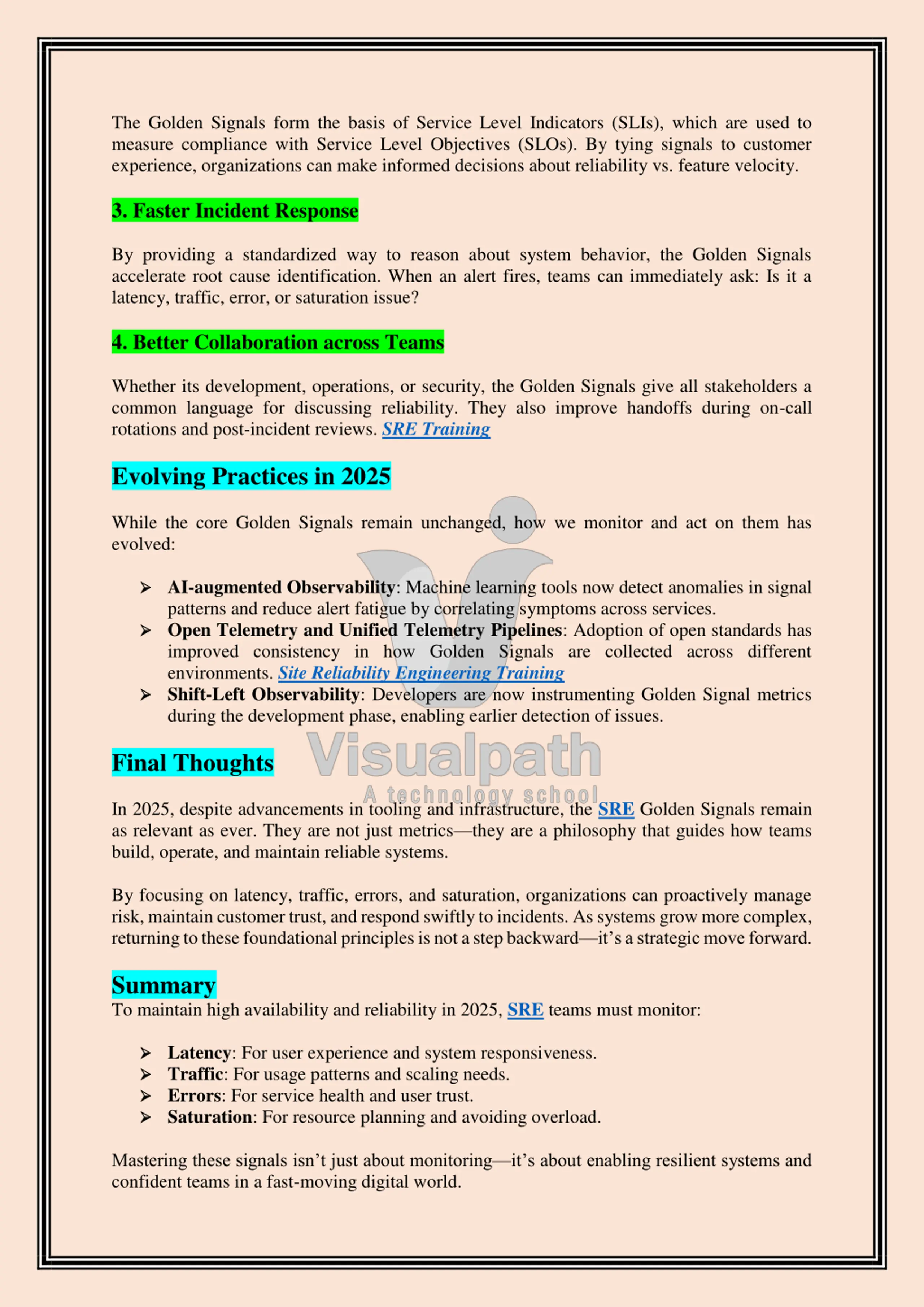 The Golden Signals form the basis of Service Level Indicators (SLIs), which are used to measure compliance with Service Level Objectives (SLOs). By tying signals to customer experience, organizations can make informed decisions about reliability vs. feature velocity. 3. Faster Incident Response By providing a standardized way to reason about system behavior, the Golden Signals accelerate root cause identification. When an alert fires, teams can immediately ask: Is it a latency, traffic, error, or saturation issue? 4. Better Collaboration across Teams Whether its development, operations, or security, the Golden Signals give all stakeholders a common language for discussing reliability. They also improve handoffs during on-call rotations and post-incident reviews. SRE Training Evolving Practices in 2025 While the core Golden Signals remain unchanged, how we monitor and act on them has evolved: AI-augmented Observability: Machine learning tools now detect anomalies in signal patterns and reduce alert fatigue by correlating symptoms across services. Open Telemetry and Unified Telemetry Pipelines: Adoption of open standards has improved consistency in how Golden Signals are collected across different environments. Site Reliability Engineering Training Shift-Left Observability: Developers are now instrumenting Golden Signal metrics during the development phase, enabling earlier detection of issues. Final Thoughts In 2025, despite advancements in tooling and infrastructure, the SRE Golden Signals remain as relevant as ever. They are not just metrics they are a philosophy that guides how teams build, operate, and maintain reliable systems. By focusing on latency, traffic, errors, and saturation, organizations can proactively manage risk, maintain customer trust, and respond swiftly to incidents. As systems grow more complex, returning to these foundational principles is not a step backward it s a strategic move forward. Summary To maintain high availability and reliability in 2025, SRE teams must monitor: Latency: For user experience and system responsiveness. Traffic: For usage patterns and scaling needs. Errors: For service health and user trust. Saturation: For resource planning and avoiding overload. Mastering these signals isn t just about monitoring it s about enabling resilient systems and confident teams in a fast-moving digital world.