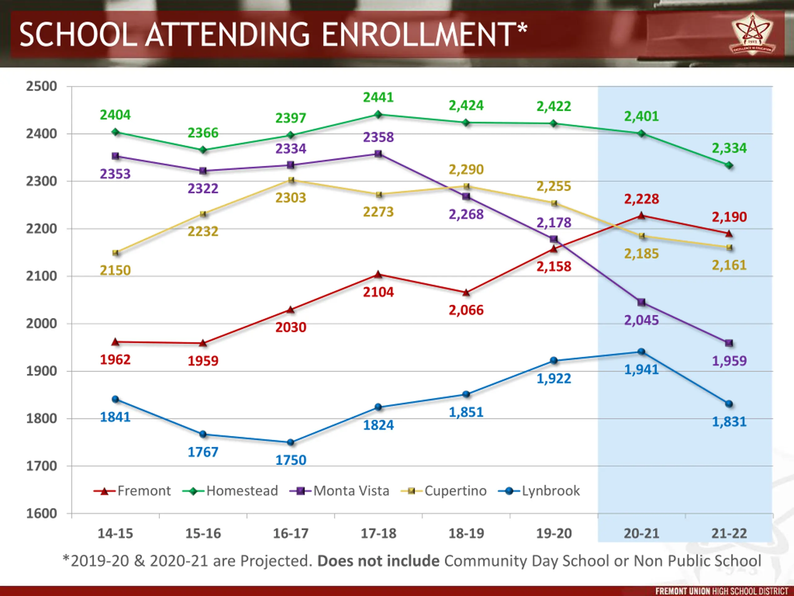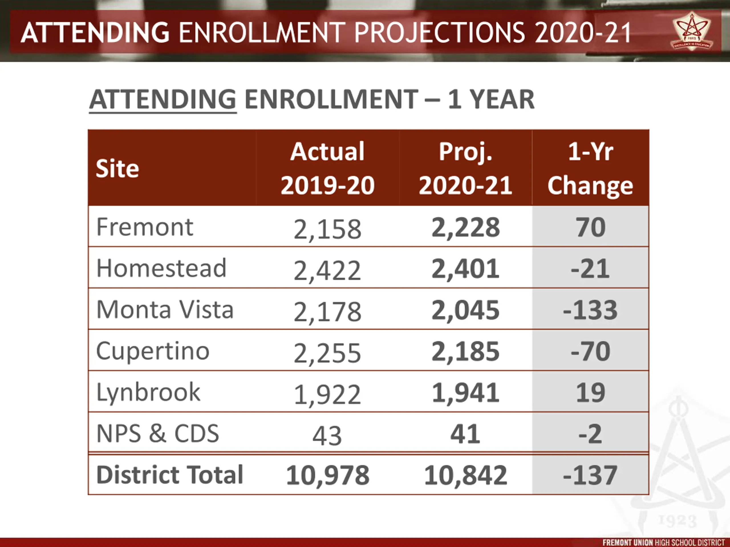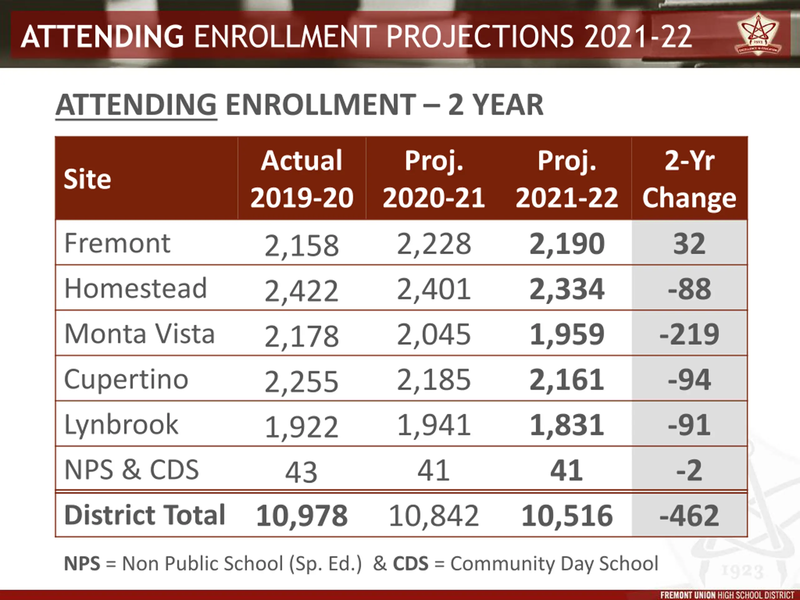 ATTENDING ENROLLMENT PROJECTIONS 2021-22 ATTENDING ENROLLMENT 2 YEAR Actual 2019-20 2,158 2,422 2,178 2,255 1,922 43 Proj. 2020-21 2,228 2,401 2,045 2,185 1,941 41 10,842 Proj. 2021-22 2,190 2,334 1,959 2,161 1,831 41 10,516 2-Yr Change 32 -88 -219 -94 -91 -2 -462 Site Fremont Homestead Monta Vista Cupertino Lynbrook NPS & CDS District Total 10,978 NPS = Non Public School (Sp. Ed.) & CDS = Community Day School