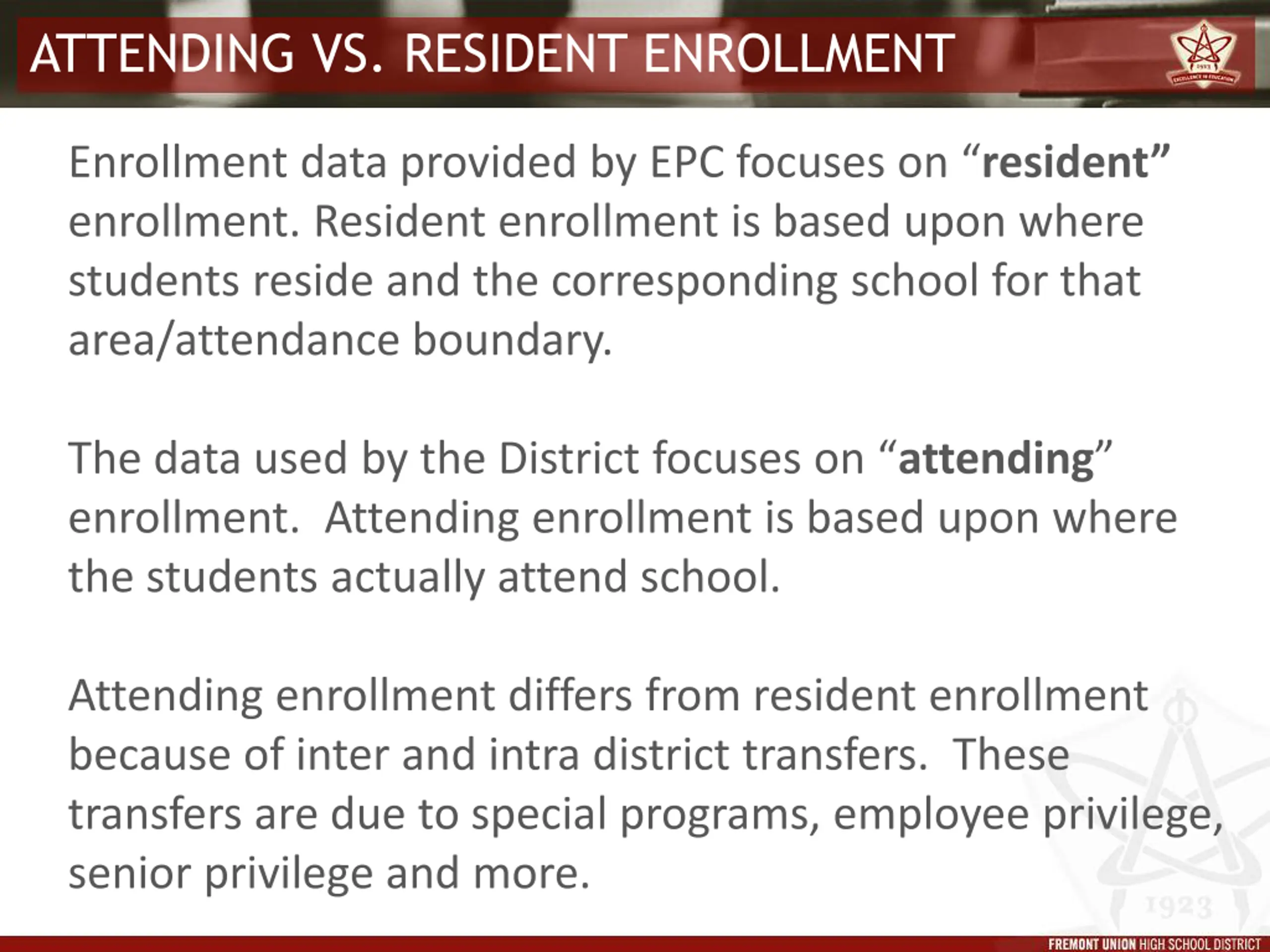 ATTENDING VS. RESIDENT ENROLLMENT Enrollment data provided by EPC focuses on resident enrollment. Resident enrollment is based upon where students reside and the corresponding school for that area/attendance boundary. The data used by the District focuses on attending enrollment. Attending enrollment is based upon where the students actually attend school. Attending enrollment differs from resident enrollment because of inter and intra district transfers. These transfers are due to special programs, employee privilege, senior privilege and more.
