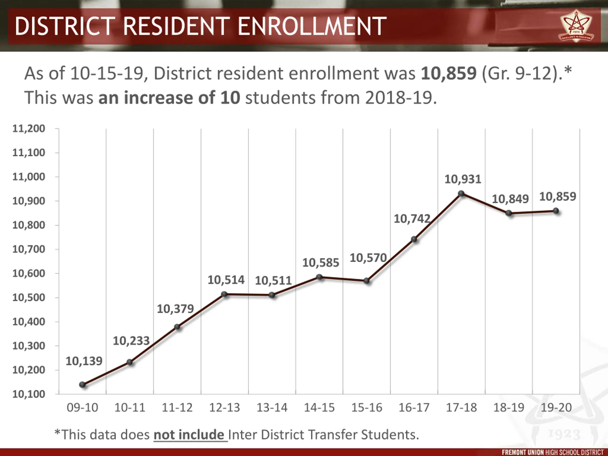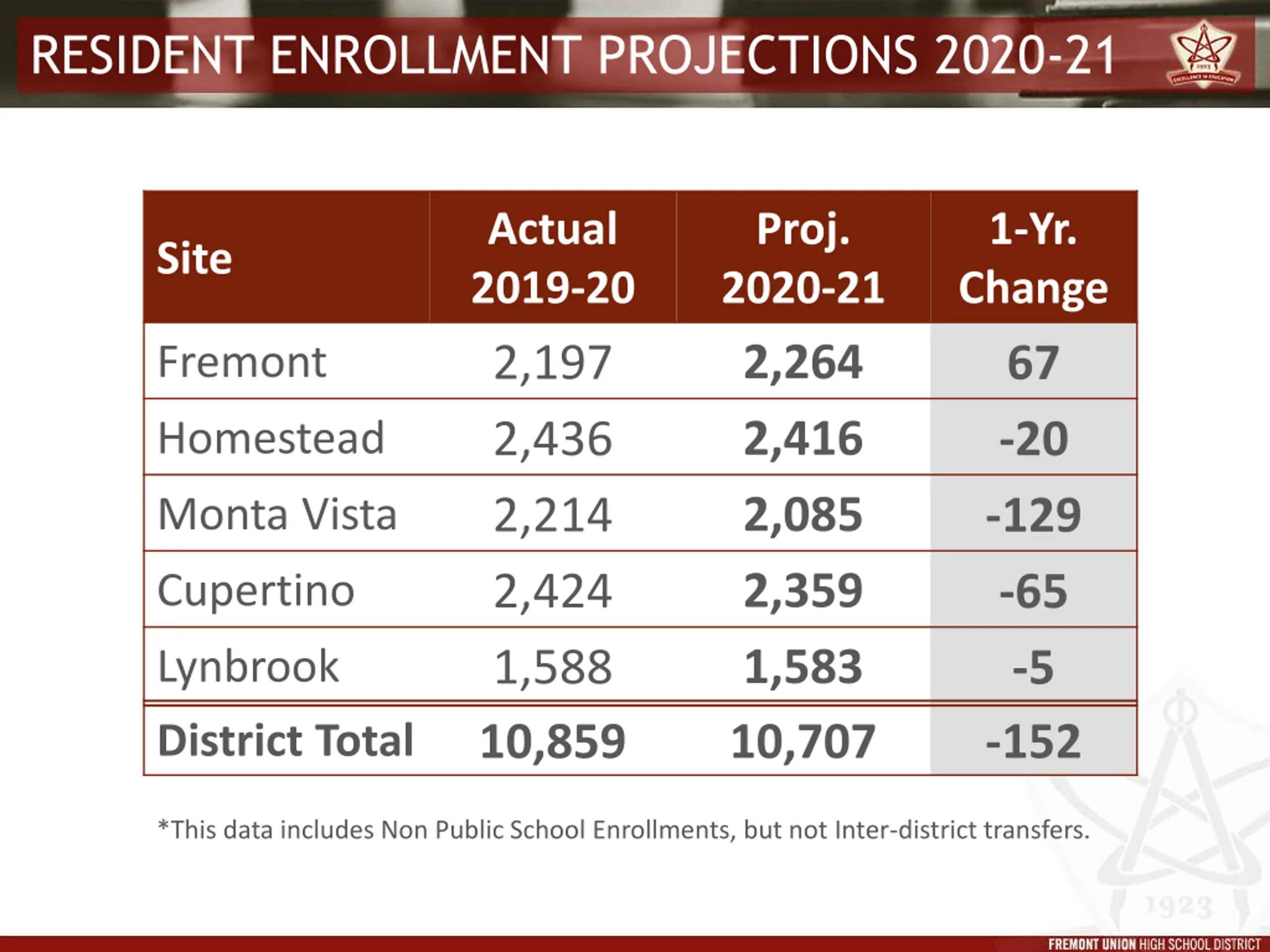 RESIDENT ENROLLMENT PROJECTIONS 2020-21 Actual 2019-20 2,197 2,436 2,214 2,424 1,588 10,859 Proj. 2020-21 2,264 2,416 2,085 2,359 1,583 10,707 1-Yr. Change 67 -20 -129 -65 -5 -152 Site Fremont Homestead Monta Vista Cupertino Lynbrook District Total *This data includes Non Public School Enrollments, but not Inter-district transfers.