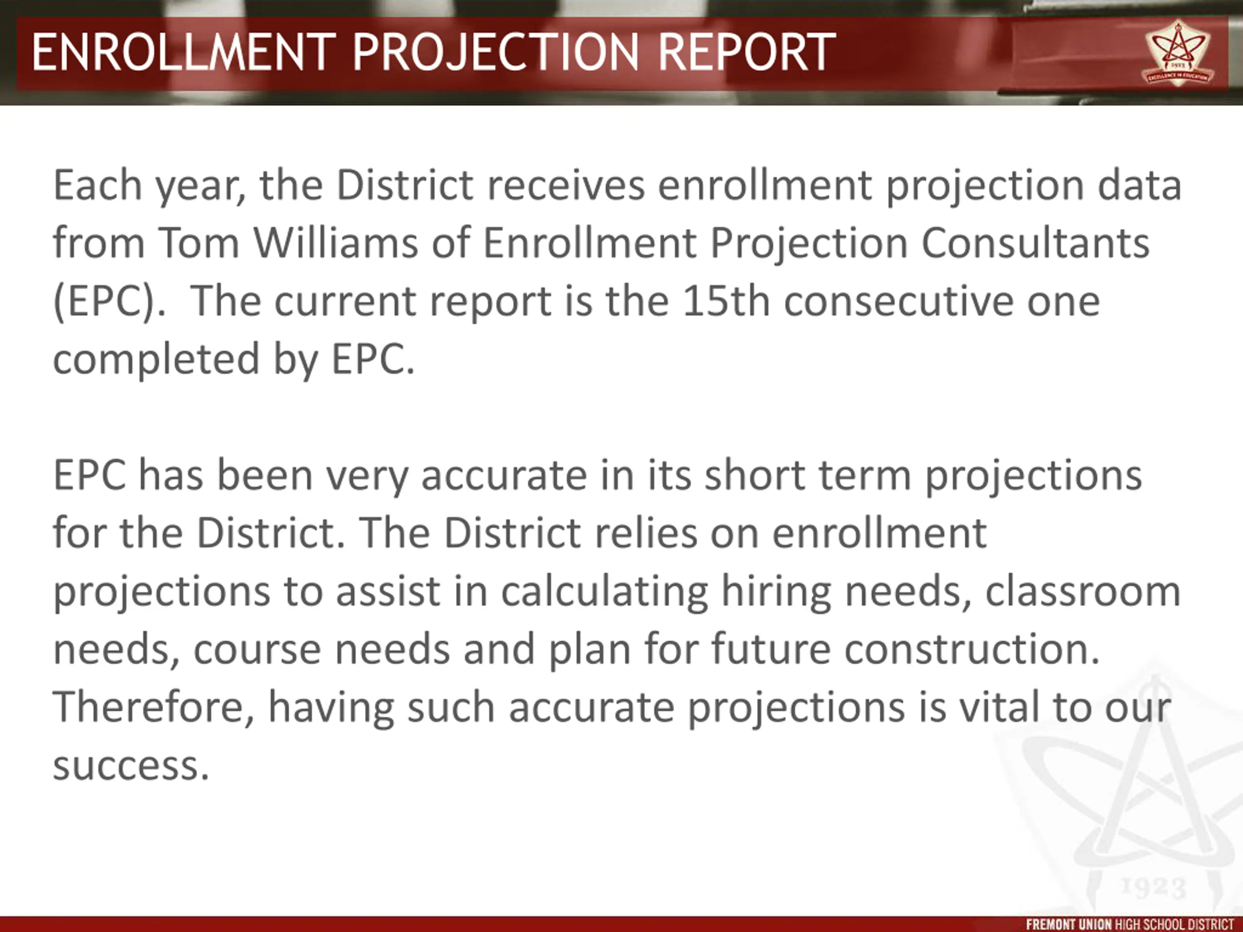 ENROLLMENT PROJECTION REPORT Each year, the District receives enrollment projection data from Tom Williams of Enrollment Projection Consultants (EPC). The current report is the 15th consecutive one completed by EPC. EPC has been very accurate in its short term projections for the District. The District relies on enrollment projections to assist in calculating hiring needs, classroom needs, course needs and plan for future construction. Therefore, having such accurate projections is vital to our success.