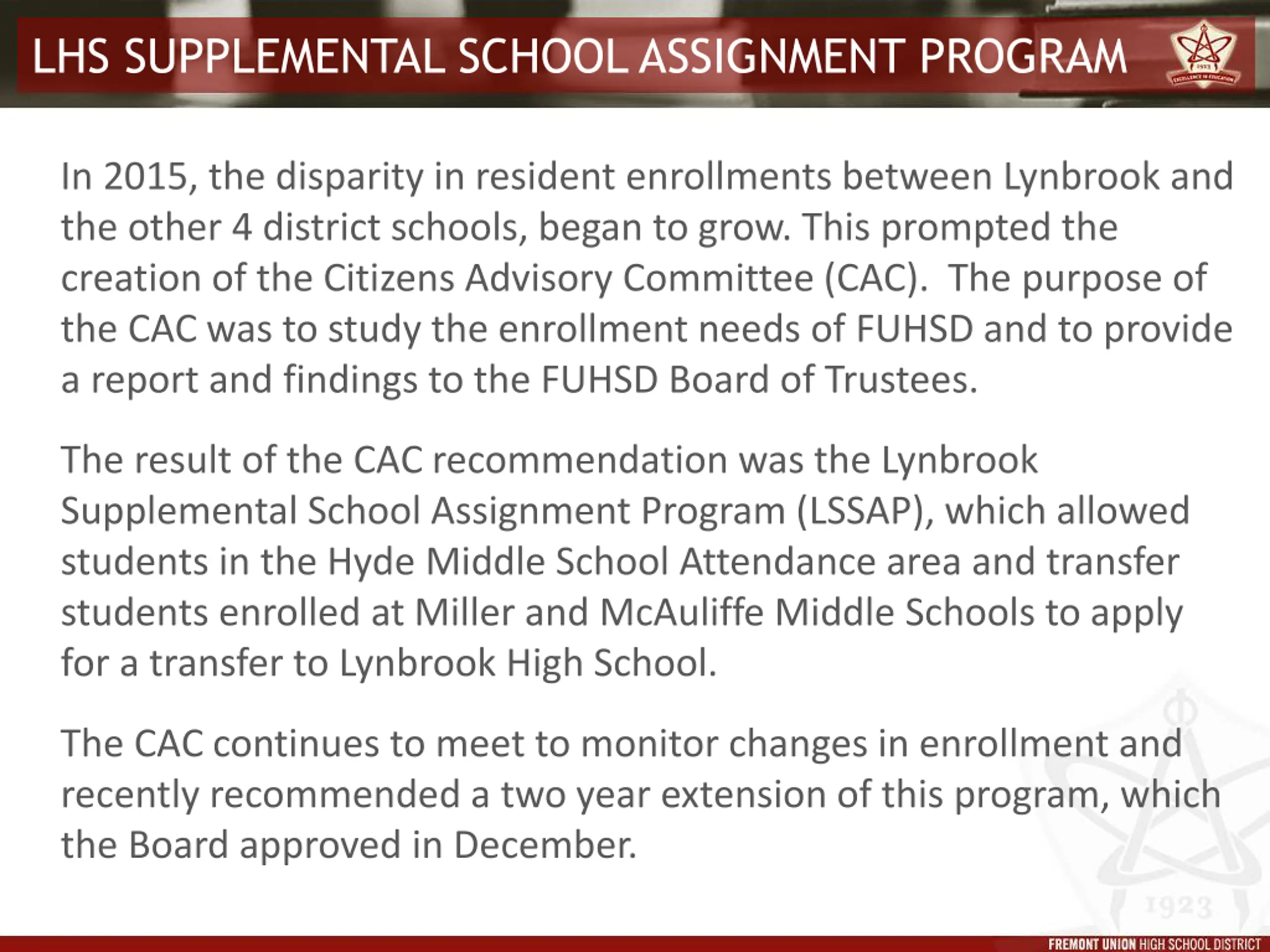 LHS SUPPLEMENTAL SCHOOL ASSIGNMENT PROGRAM In 2015, the disparity in resident enrollments between Lynbrook and the other 4 district schools, began to grow. This prompted the creation of the Citizens Advisory Committee (CAC). The purpose of the CAC was to study the enrollment needs of FUHSD and to provide a report and findings to the FUHSD Board of Trustees. The result of the CAC recommendation was the Lynbrook Supplemental School Assignment Program (LSSAP), which allowed students in the Hyde Middle School Attendance area and transfer students enrolled at Miller and McAuliffe Middle Schools to apply for a transfer to Lynbrook High School. The CAC continues to meet to monitor changes in enrollment and recently recommended a two year extension of this program, which the Board approved in December.