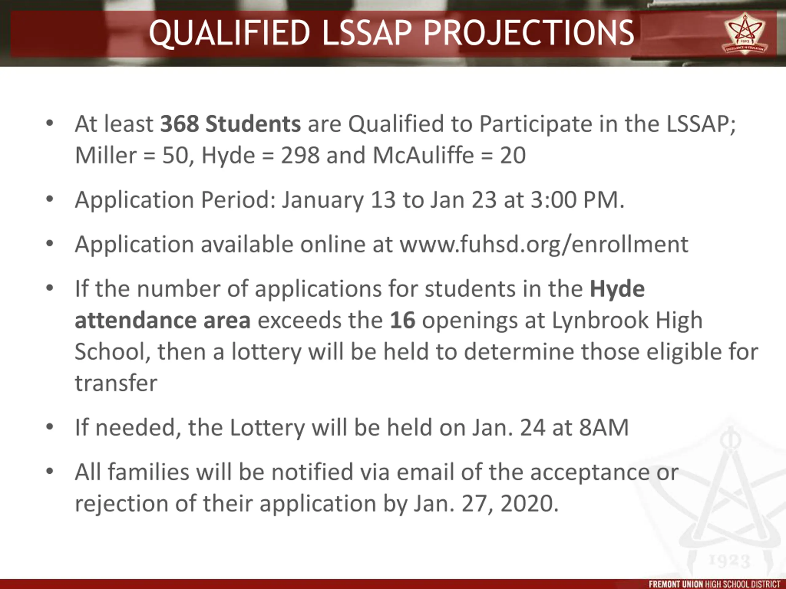 QUALIFIED LSSAP PROJECTIONS At least 368 Students are Qualifiedto Participate in the LSSAP; Miller = 50, Hyde = 298 and McAuliffe = 20 Application Period: January 13 to Jan 23 at 3:00 PM. Application available online at www.fuhsd.org/enrollment If the number of applications for students in the Hyde attendance area exceeds the 16 openings at Lynbrook High School, then a lottery will be held to determine those eligible for transfer If needed, the Lottery will be held on Jan. 24 at 8AM All families will be notified via email of the acceptance or rejection of their application by Jan. 27, 2020.
