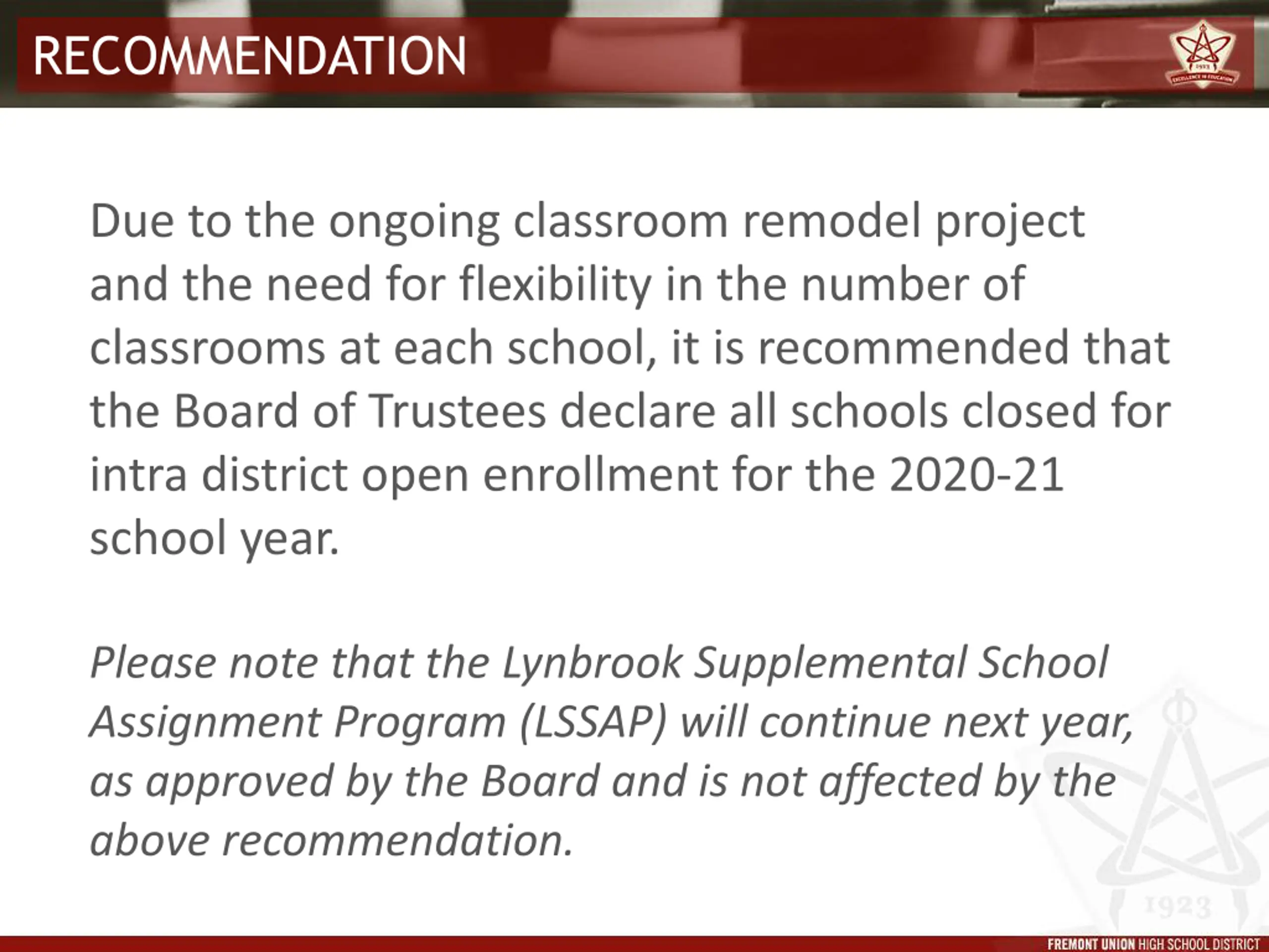 RECOMMENDATION Due to the ongoing classroom remodel project and the need for flexibility in the number of classrooms at each school, it is recommended that the Board of Trustees declare all schools closed for intra district open enrollment for the 2020-21 school year. Please note that the Lynbrook Supplemental School Assignment Program (LSSAP) will continue next year, as approved by the Board and is not affected by the above recommendation.