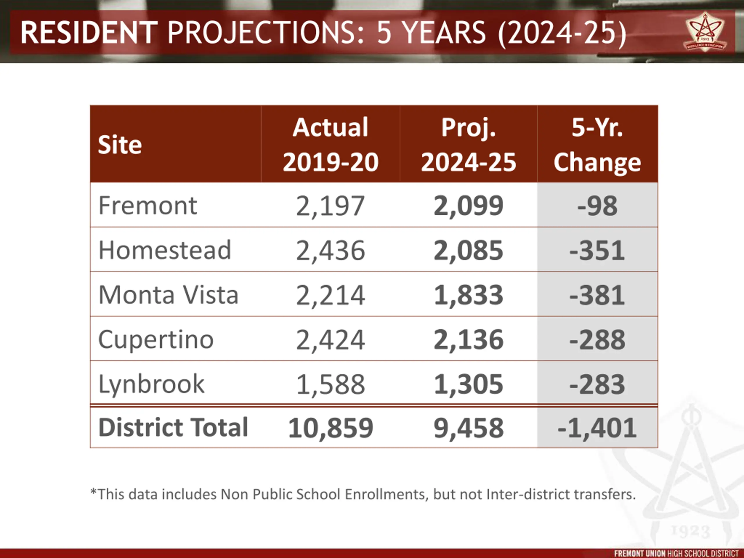RESIDENT PROJECTIONS: 5 YEARS (2024-25) Actual 2019-20 2,197 2,436 2,214 2,424 1,588 10,859 Proj. 2024-25 2,099 2,085 1,833 2,136 1,305 9,458 5-Yr. Change -98 -351 -381 -288 -283 -1,401 Site Fremont Homestead Monta Vista Cupertino Lynbrook District Total *This data includes Non Public School Enrollments, but not Inter-district transfers.
