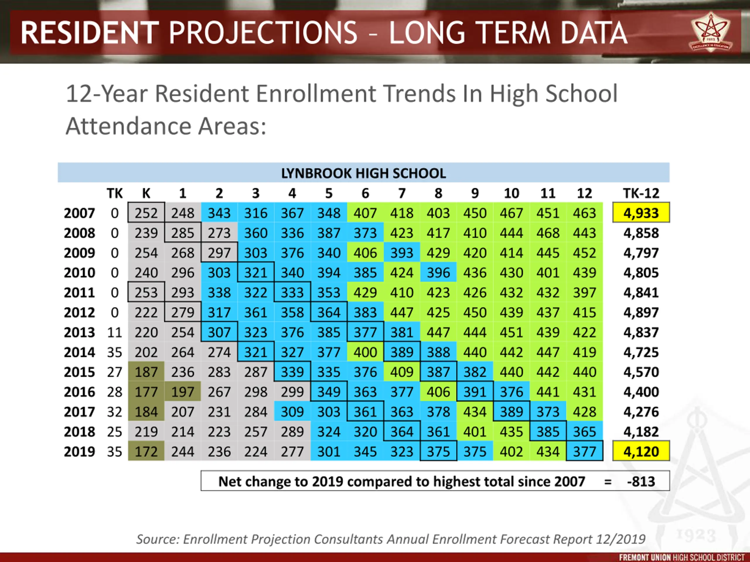 RESIDENT PROJECTIONS LONG TERM DATA 12-Year Resident Enrollment Trends In High School Attendance Areas: LYNBROOK HIGH SCHOOL 4 5 6 TK 0 0 0 0 0 0 K 1 2 3 7 8 9 10 11 12 TK-12 4,933 4,858 4,797 4,805 4,841 4,897 4,837 4,725 4,570 4,400 4,276 4,182 4,120 2007 2008 2009 2010 2011 2012 2013 11 220 254 307 323 376 385 377 381 447 444 451 439 422 2014 35 202 264 274 321 327 377 400 389 388 440 442 447 419 2015 27 187 236 283 287 339 335 376 409 387 382 440 442 440 2016 28 177 197 267 298 299 349 363 377 406 391 376 441 431 2017 32 184 207 231 284 309 303 361 363 378 434 389 373 428 2018 25 219 214 223 257 289 324 320 364 361 401 435 385 365 2019 35 172 244 236 224 277 301 345 323 375 375 402 434 377 252 248 343 316 367 348 407 418 403 450 467 451 463 239 285 273 360 336 387 373 423 417 410 444 468 443 254 268 297 303 376 340 406 393 429 420 414 445 452 240 296 303 321 340 394 385 424 396 436 430 401 439 253 293 338 322 333 353 429 410 423 426 432 432 397 222 279 317 361 358 364 383 447 425 450 439 437 415 Net change to 2019 compared to highest total since 2007 = -813 Source: Enrollment Projection Consultants Annual Enrollment Forecast Report 12/2019