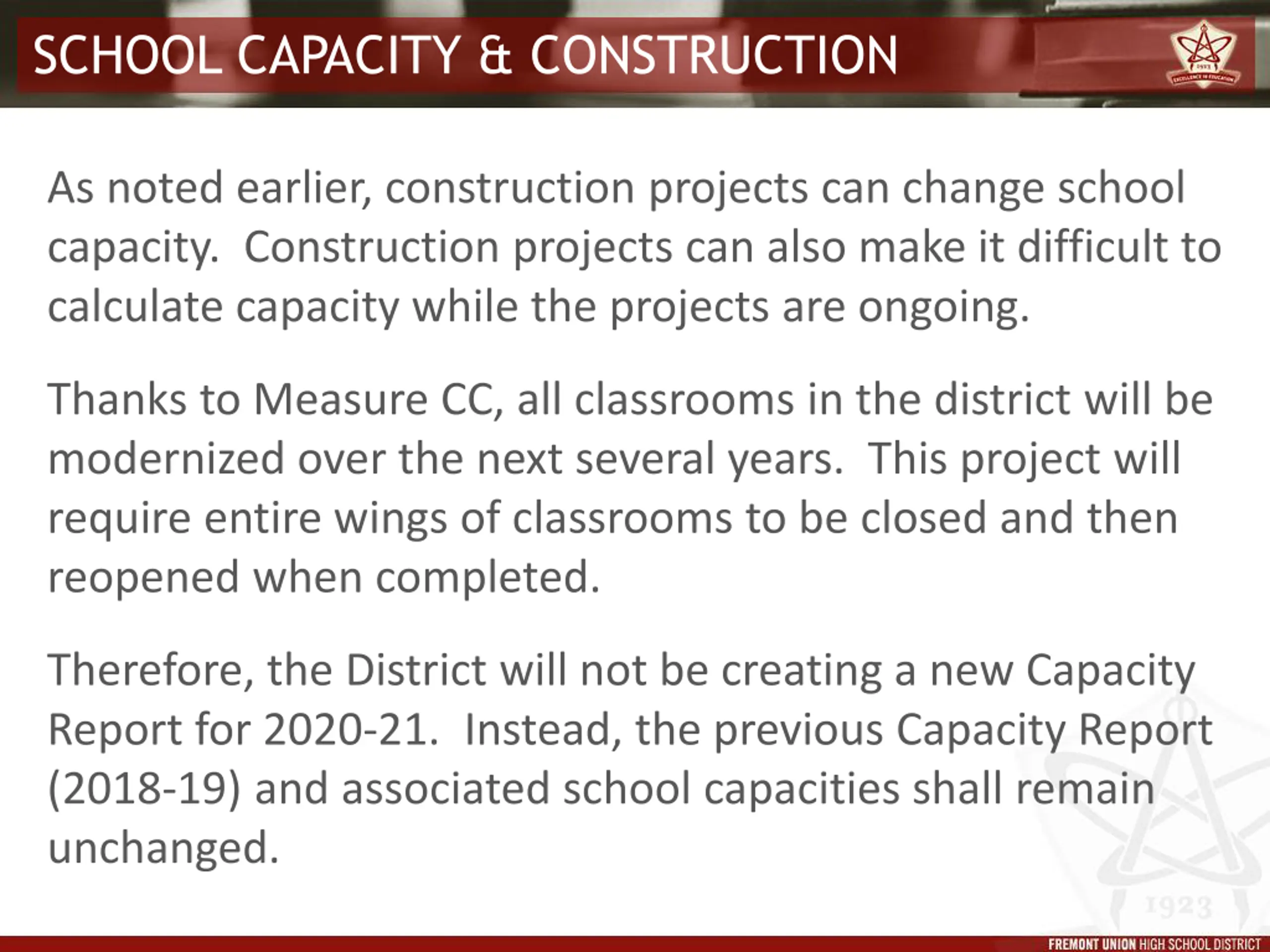 SCHOOL CAPACITY & CONSTRUCTION As noted earlier, construction projects can change school capacity. Construction projects can also make it difficult to calculate capacity while the projects are ongoing. Thanks to Measure CC, all classrooms in the district will be modernized over the next several years. This project will require entire wings of classrooms to be closed and then reopened when completed. Therefore, the District will not be creating a new Capacity Report for 2020-21. Instead, the previous Capacity Report (2018-19) and associated school capacities shall remain unchanged.