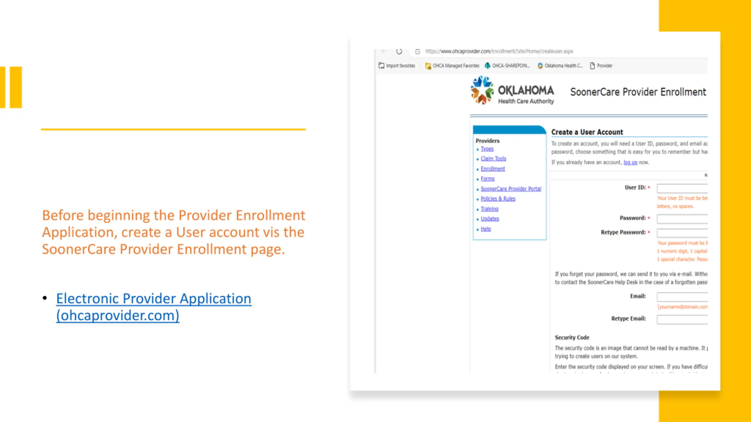 Before beginning the Provider Enrollment Application, create a User account vis the SoonerCare Provider Enrollment page. Electronic Provider Application (ohcaprovider.com)