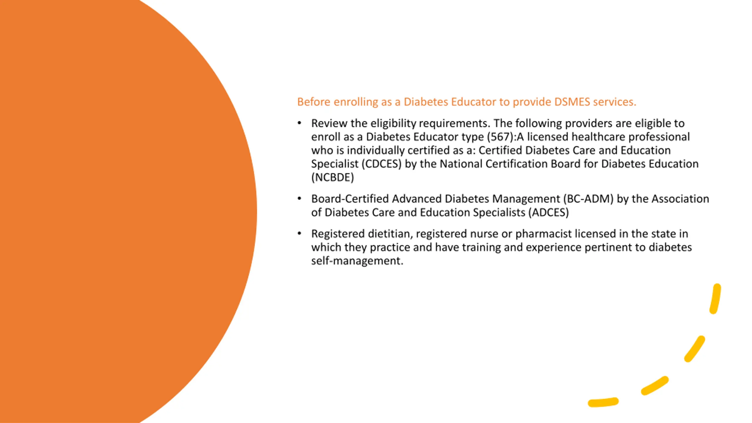 Before enrolling as a Diabetes Educator to provide DSMES services. Review the eligibility requirements. The following providers are eligible to enroll as a Diabetes Educator type (567):A licensed healthcare professional who is individually certified as a: Certified Diabetes Care and Education Specialist (CDCES) by the National Certification Board for Diabetes Education (NCBDE) Board-Certified Advanced Diabetes Management (BC-ADM) by the Association of Diabetes Care and Education Specialists (ADCES) Registered dietitian, registered nurse or pharmacist licensed in the state in which they practice and have training and experience pertinent to diabetes self-management.