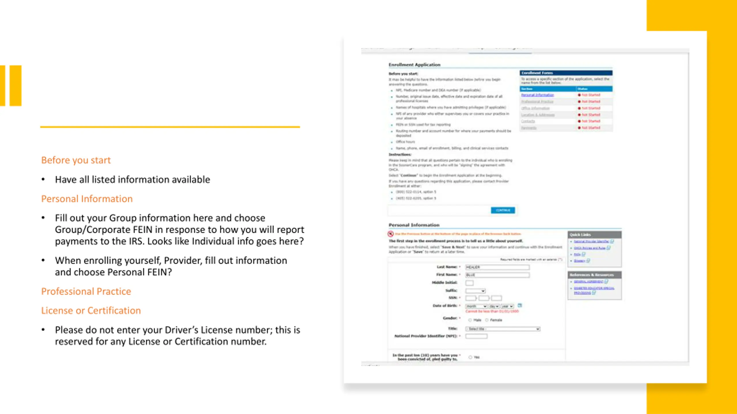 Before you start Have all listed information available Personal Information Fill out your Group information here and choose Group/Corporate FEIN in response to how you will report payments to the IRS. Looks like Individual info goes here? When enrolling yourself, Provider, fill out information and choose Personal FEIN? Professional Practice License or Certification Please do not enter your Driver s License number; this is reserved for any License or Certification number.