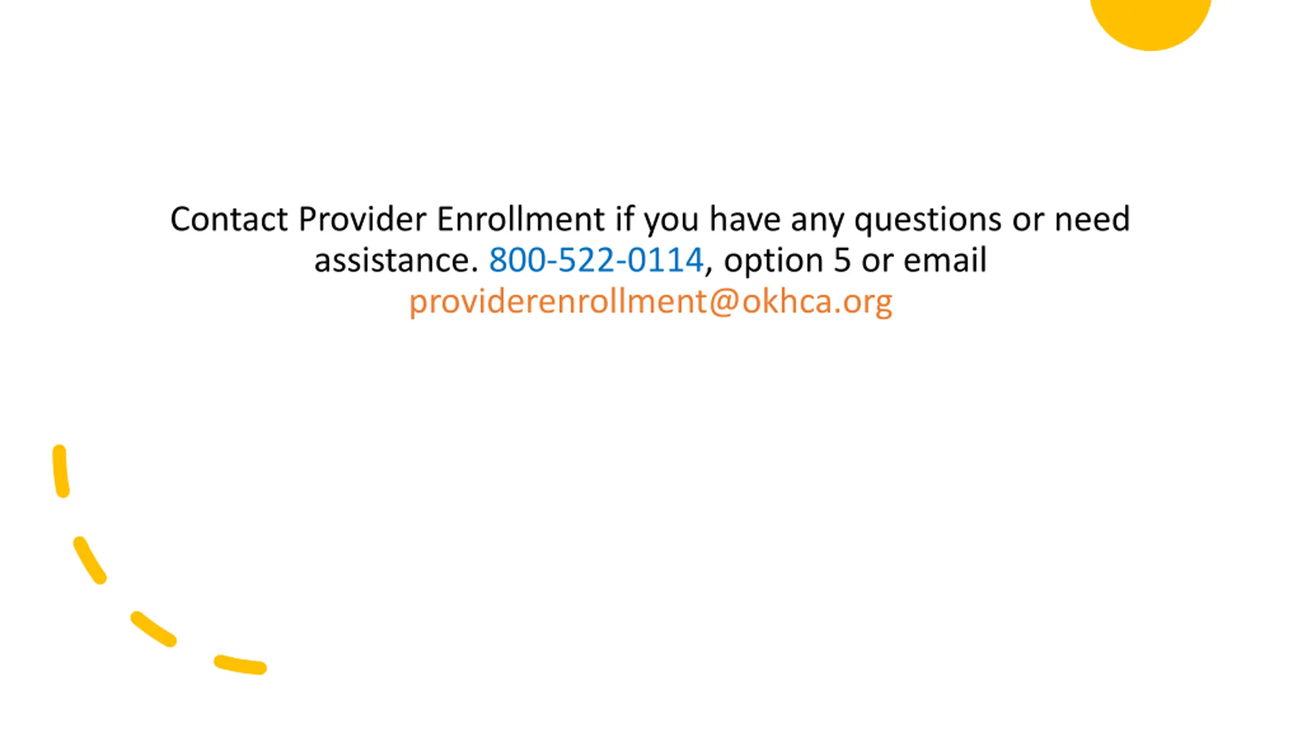 Contact Provider Enrollment if you have any questions or need assistance. 800-522-0114, option 5 or email providerenrollment@okhca.org