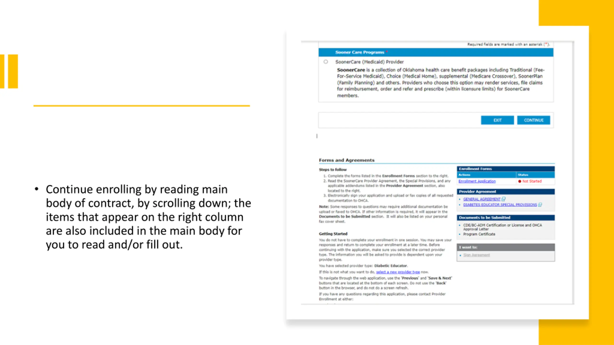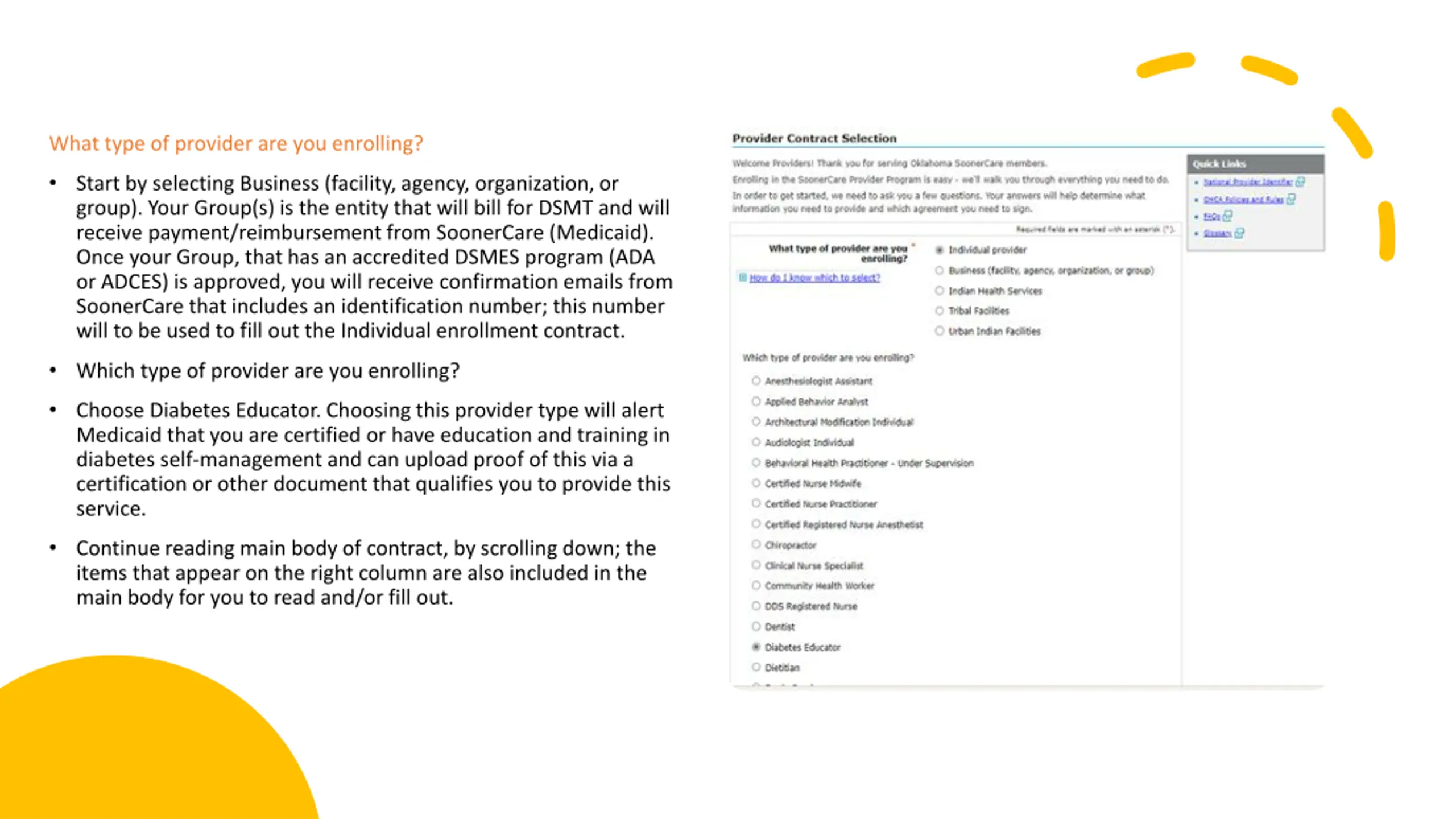 What type of provider are you enrolling? Start by selecting Business (facility, agency, organization, or group). Your Group(s) is the entity that will bill for DSMT and will receive payment/reimbursement from SoonerCare (Medicaid). Once your Group, that has an accredited DSMES program (ADA or ADCES) is approved, you will receive confirmation emails from SoonerCare that includes an identification number; this number will to be used to fill out the Individual enrollment contract. Which type of provider are you enrolling? Choose Diabetes Educator. Choosing this provider type will alert Medicaid that you are certified or have education and training in diabetes self-management and can upload proof of this via a certification or other document that qualifies you to provide this service. Continue reading main body of contract, by scrolling down; the items that appear on the right column are also included in the main body for you to read and/or fill out.