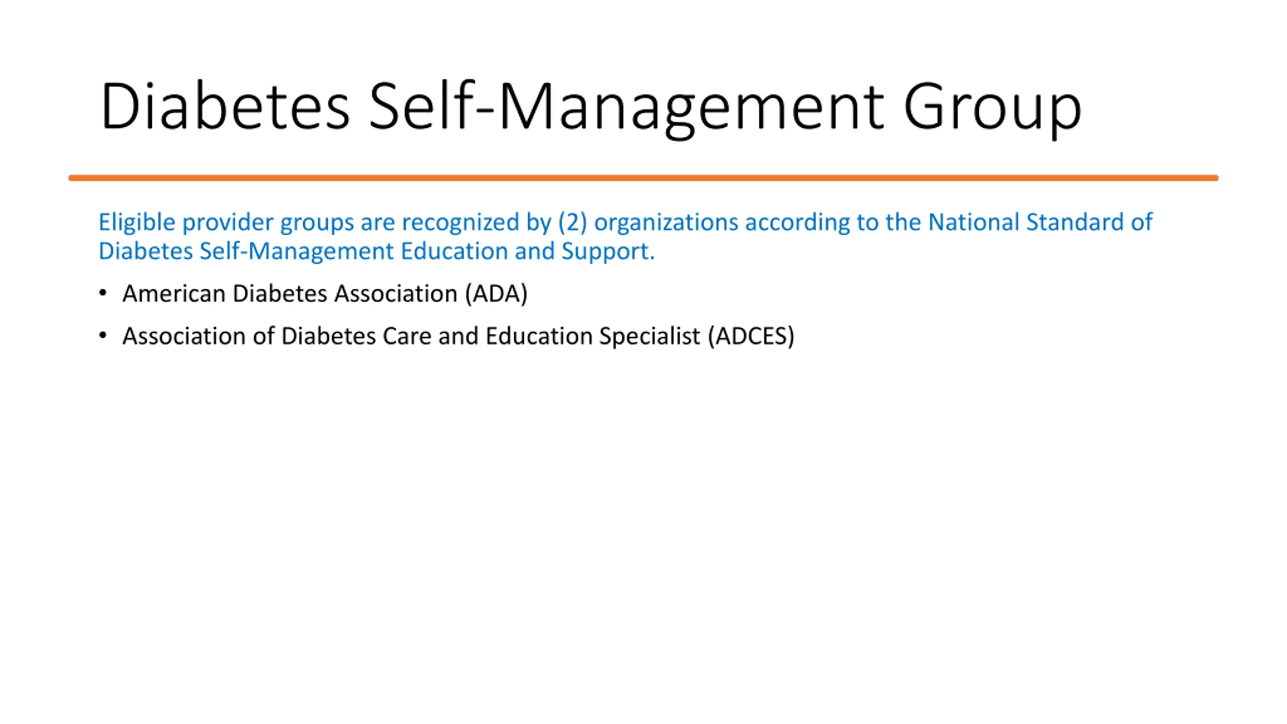 Diabetes Self-Management Group Eligible provider groups are recognized by (2) organizations according to the National Standard of Diabetes Self-Management Education and Support. American Diabetes Association (ADA) Association of Diabetes Care and Education Specialist (ADCES)