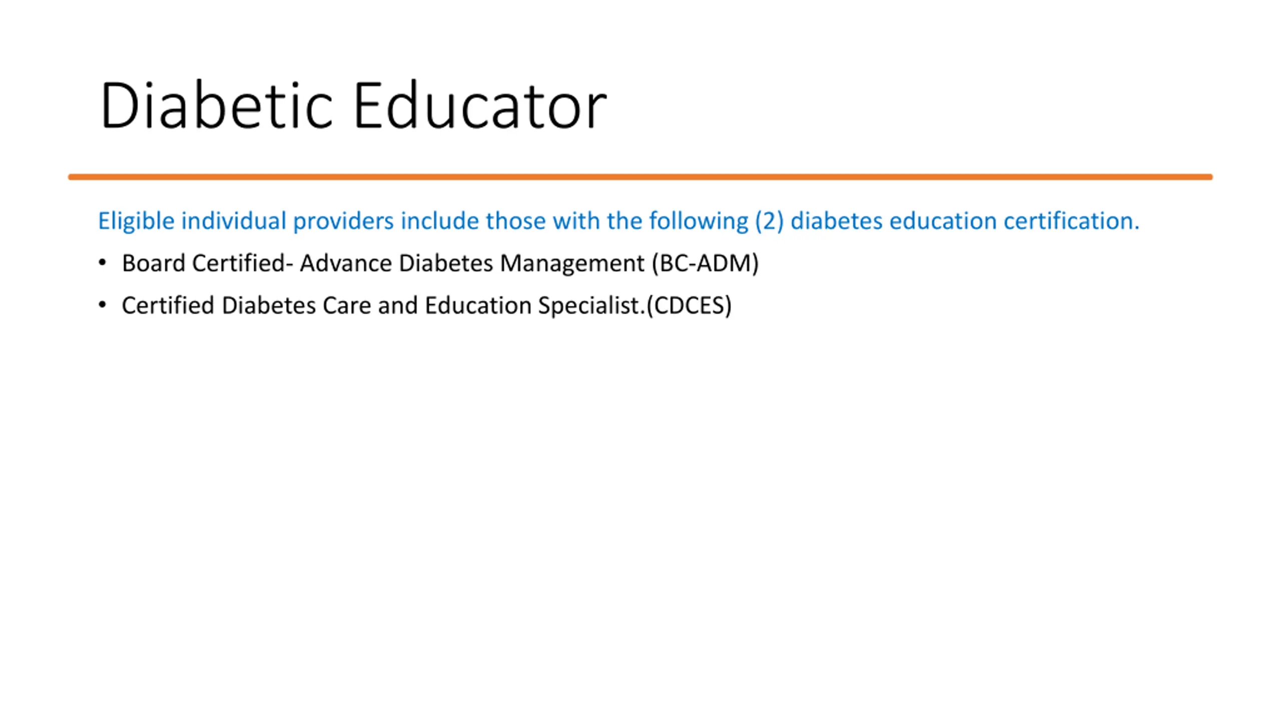 Diabetic Educator Eligible individual providers include those with the following (2) diabetes education certification. Board Certified- Advance Diabetes Management (BC-ADM) Certified Diabetes Care and Education Specialist.(CDCES)