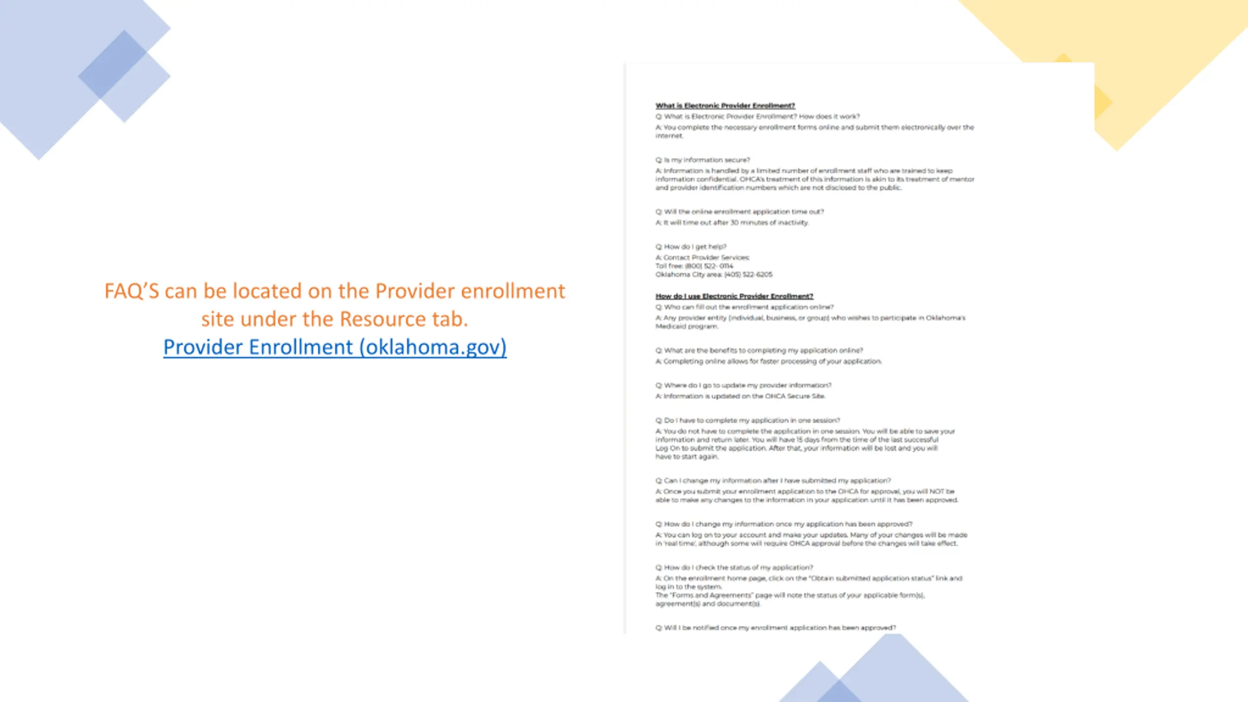FAQS can be located on the Provider enrollment site under the Resource tab. Provider Enrollment (oklahoma.gov)