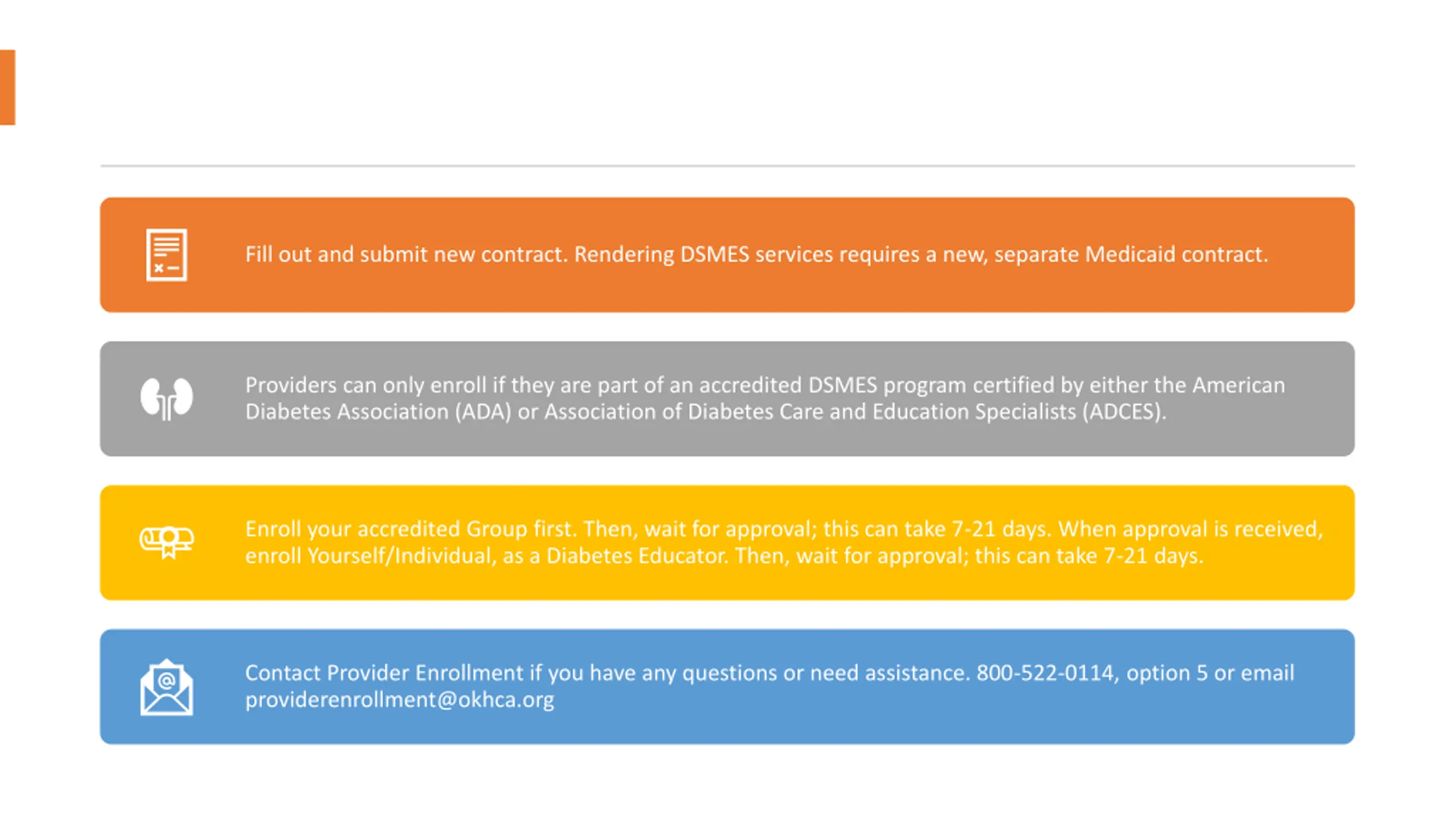 Fill out and submit new contract. Rendering DSMES services requires a new, separate Medicaid contract. Providers can only enroll if they are part of an accredited DSMES program certified by either the American Diabetes Association (ADA) or Association of Diabetes Care and Education Specialists (ADCES). Enroll your accredited Group first. Then, wait for approval; this can take 7-21 days. When approval is received, enroll Yourself/Individual, as a Diabetes Educator. Then, wait for approval; this can take 7-21 days. Contact Provider Enrollment if you have any questions or need assistance. 800-522-0114, option 5 or email providerenrollment@okhca.org