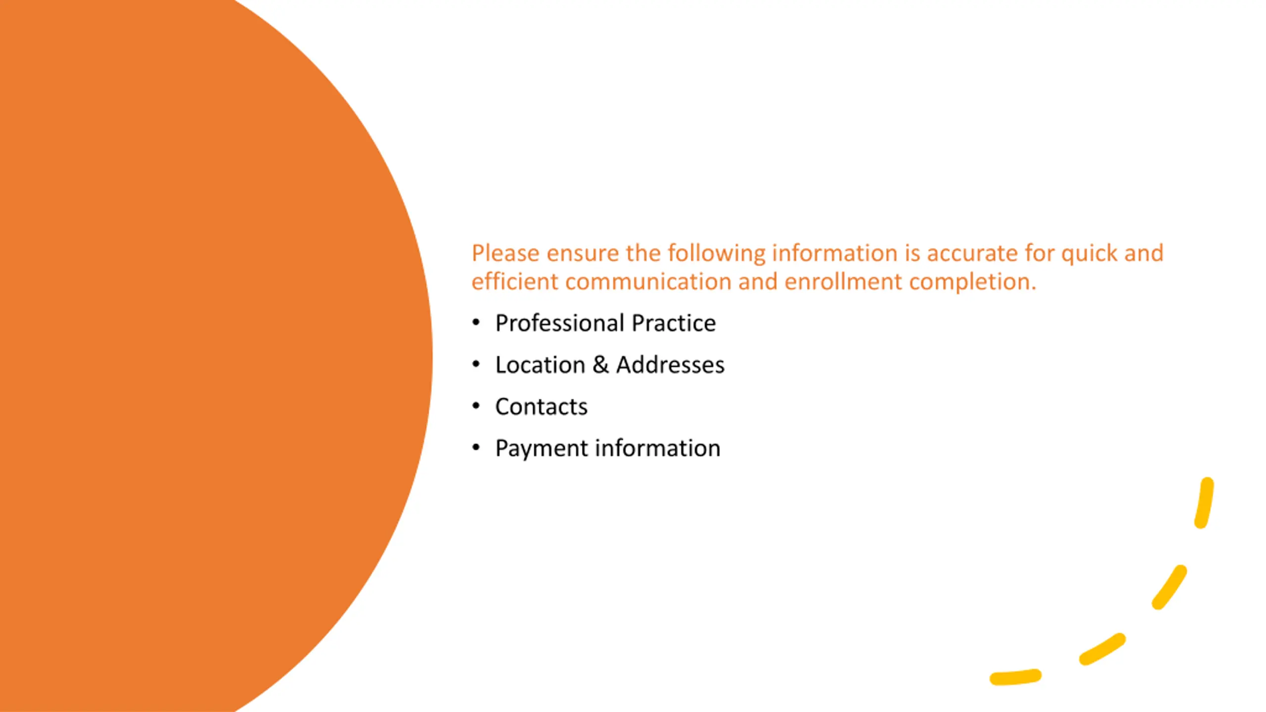Please ensure the following information is accurate for quick and efficient communication and enrollment completion. Professional Practice Location & Addresses Contacts Payment information