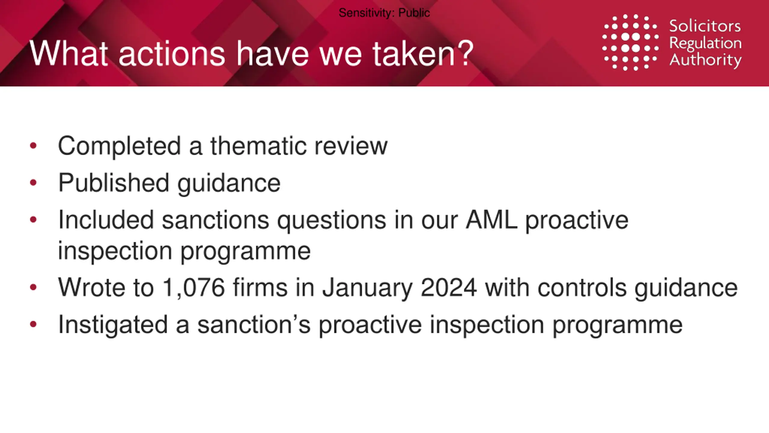 Sensitivity: Public What actions have we taken? Completed a thematic review Published guidance Included sanctions questions in our AML proactive inspection programme Wrote to 1,076 firms in January 2024 with controls guidance Instigated a sanction s proactive inspection programme