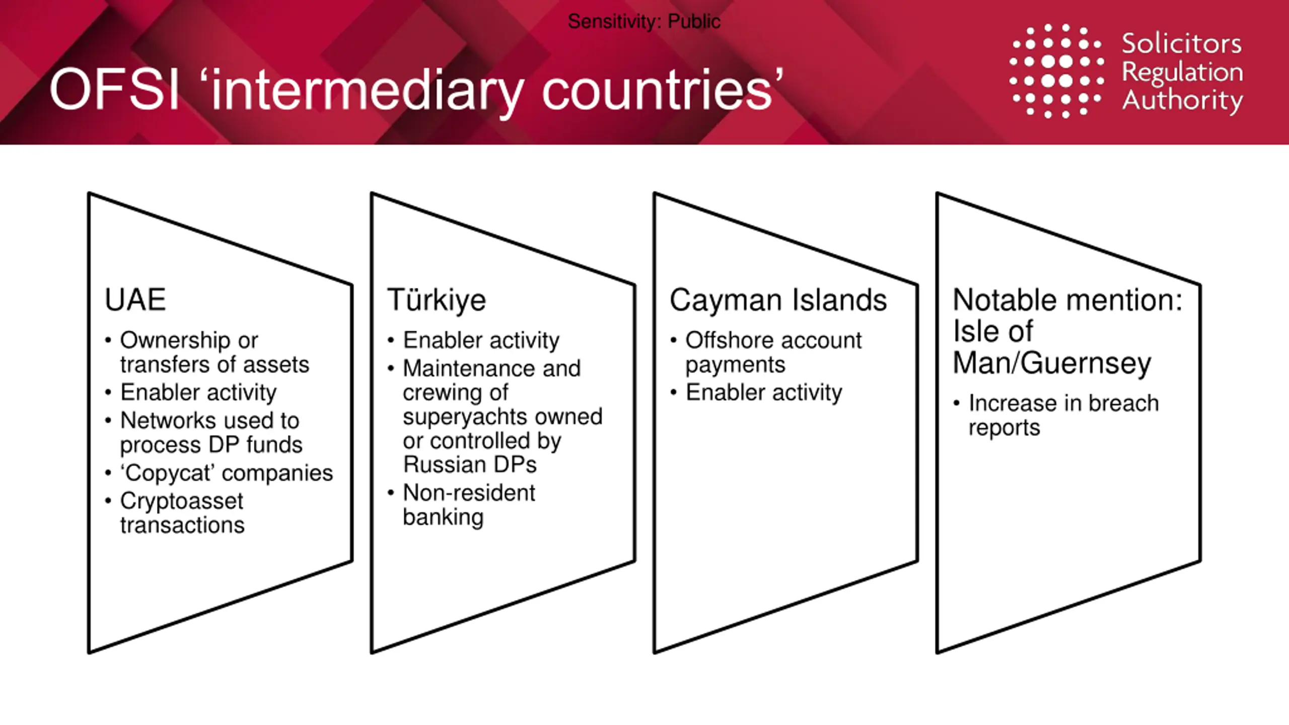 Sensitivity: Public OFSI intermediary countries UAE Ownership or transfers of assets Enabler activity Networks used to process DP funds Copycat companies Cryptoasset transactions T rkiye Enabler activity Maintenance and crewing of superyachts owned or controlled by Russian DPs Non-resident banking Cayman Islands Offshore account payments Enabler activity Notable mention: Isle of Man/Guernsey Increase in breach reports