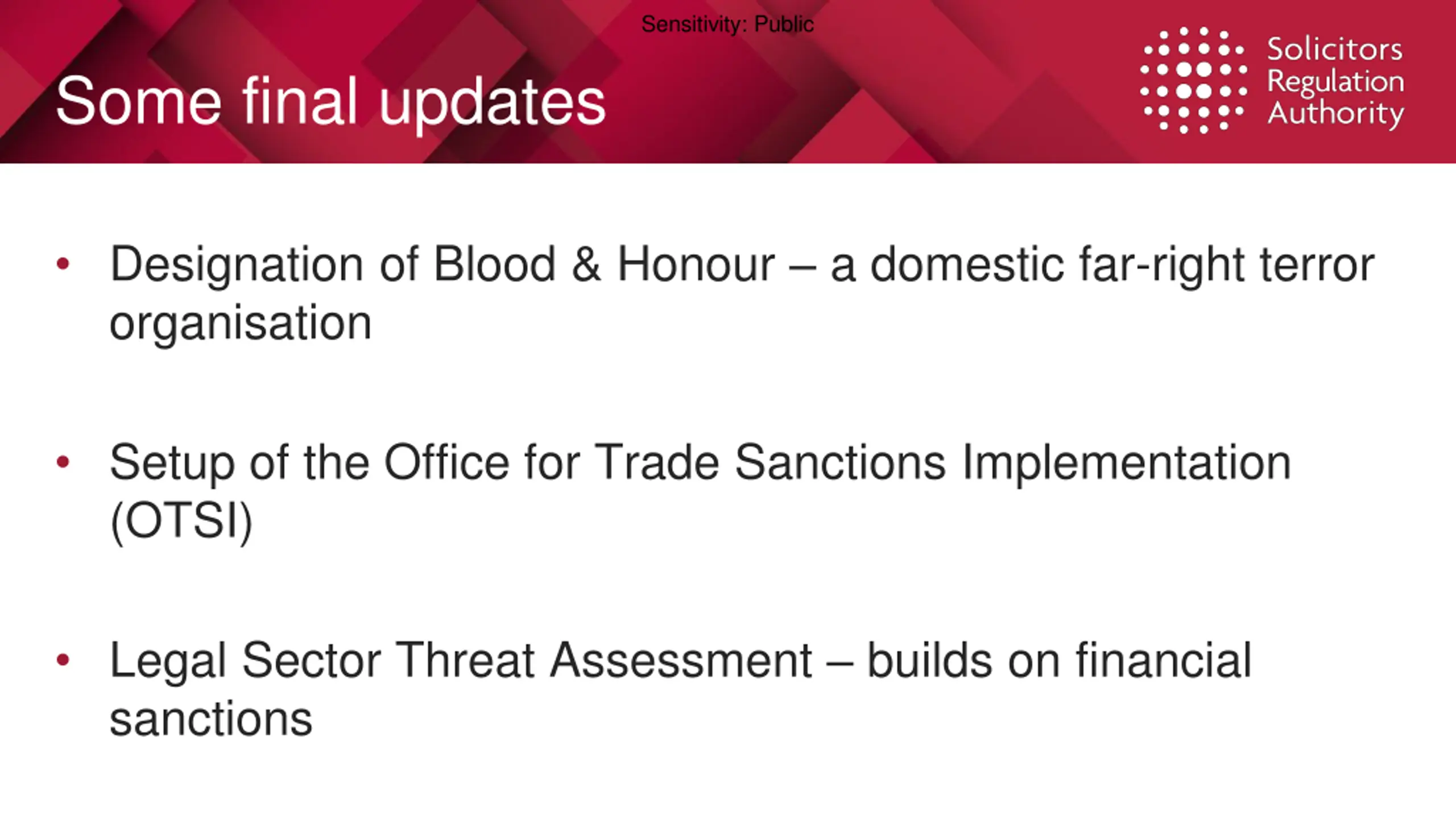 Sensitivity: Public Some final updates Designation of Blood & Honour a domestic far-right terror organisation Setup of the Office for Trade Sanctions Implementation (OTSI) Legal Sector Threat Assessment builds on financial sanctions