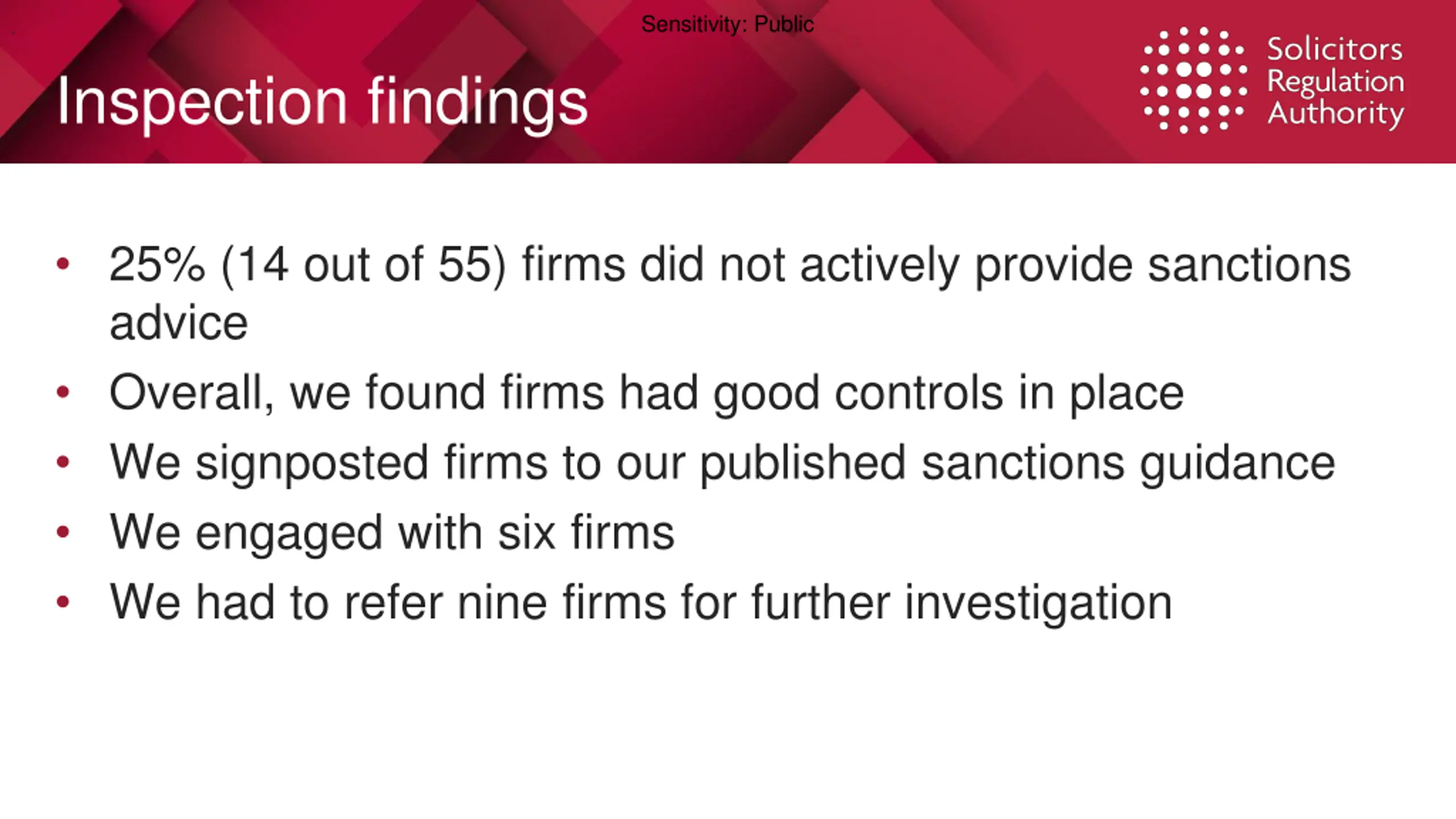 Sensitivity: Public . Inspection findings 25% (14 out of 55) firms did not actively provide sanctions advice Overall, we found firms had good controls in place We signposted firms to our published sanctions guidance We engaged with six firms We had to refer nine firms for further investigation