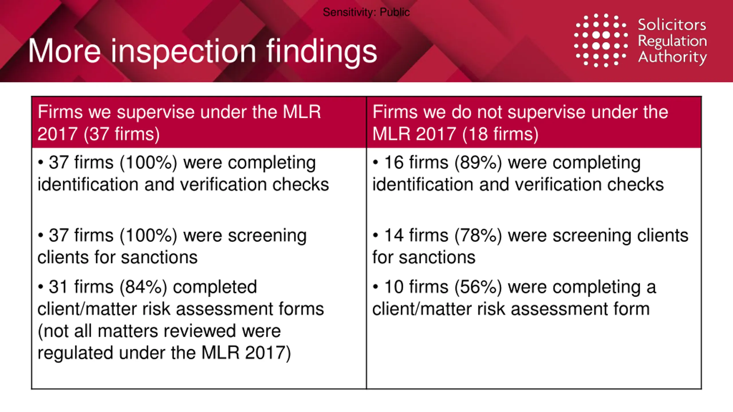 Sensitivity: Public More inspection findings Firms we supervise under the MLR 2017 (37 firms) 37 firms (100%) were completing identification and verification checks Firms we do not supervise under the MLR 2017 (18 firms) 16 firms (89%) were completing identification and verification checks 37 firms (100%) were screening clients for sanctions 31 firms (84%) completed client/matter risk assessment forms (not all matters reviewed were regulated under the MLR 2017) 14 firms (78%) were screening clients for sanctions 10 firms (56%) were completing a client/matter risk assessment form