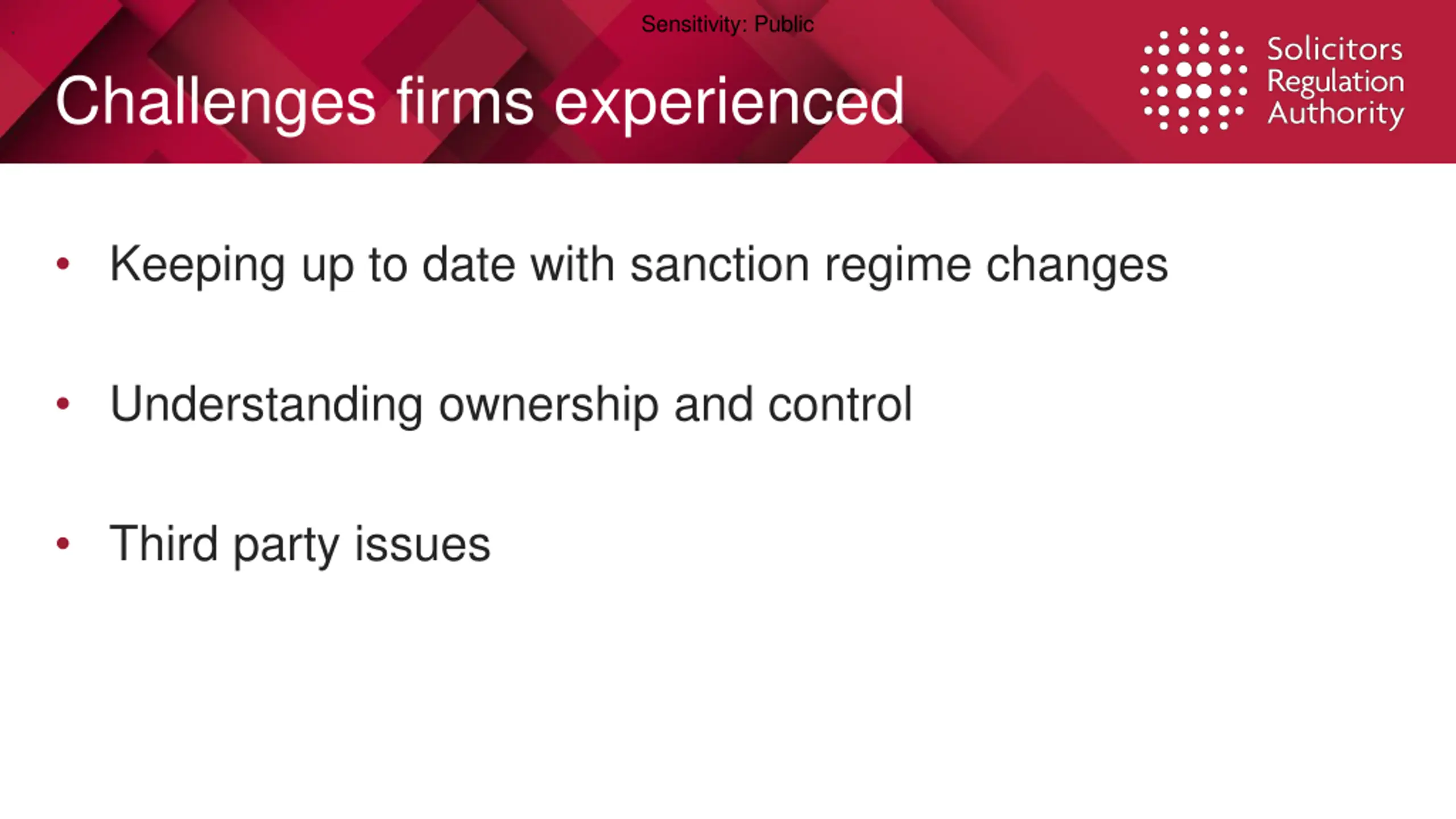 Sensitivity: Public . Challenges firms experienced Keeping up to date with sanction regime changes Understanding ownership and control Third party issues