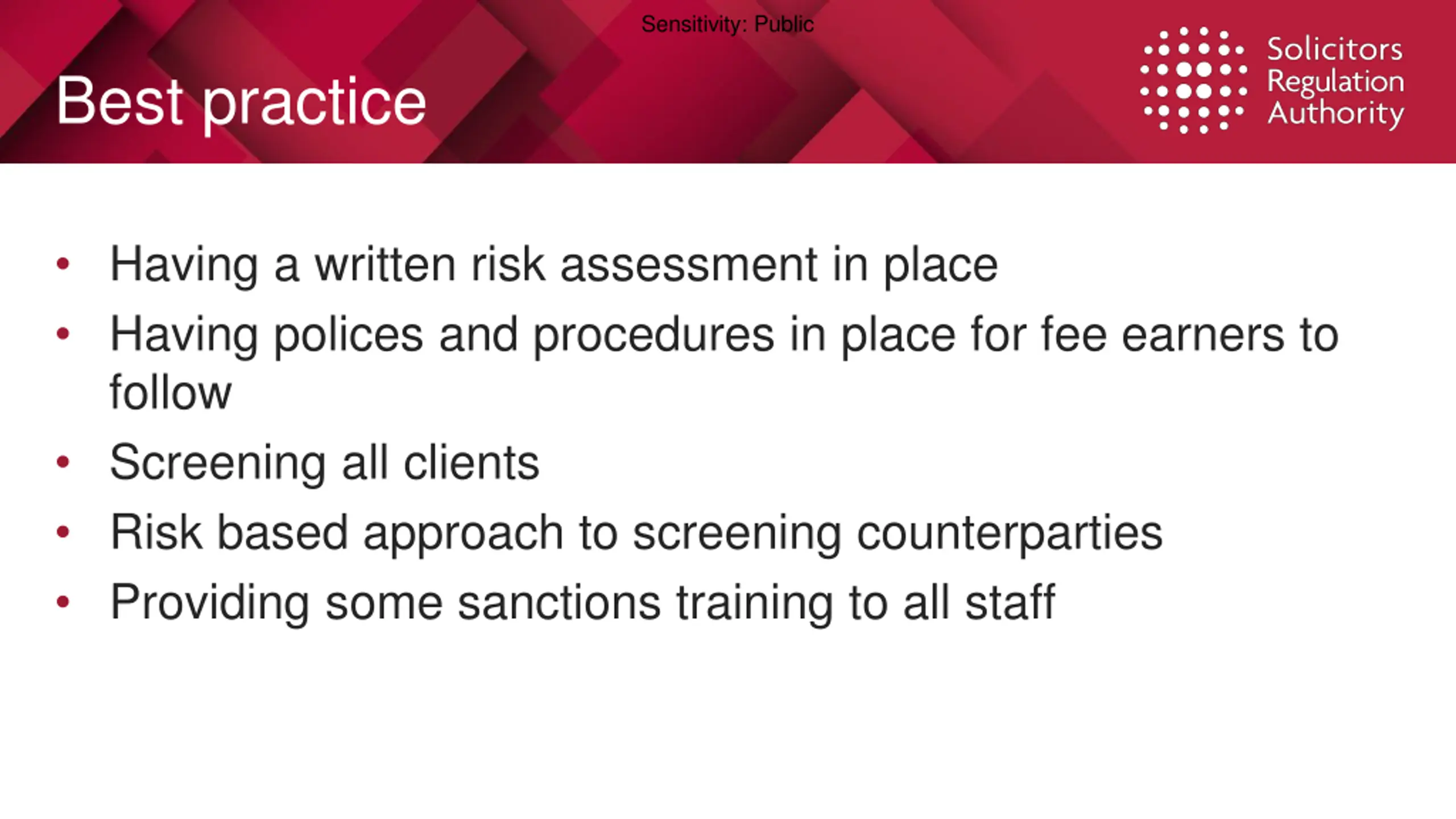Sensitivity: Public Best practice Having a written risk assessment in place Having polices and procedures in place for fee earners to follow Screening all clients Risk based approach to screening counterparties Providing some sanctions training to all staff