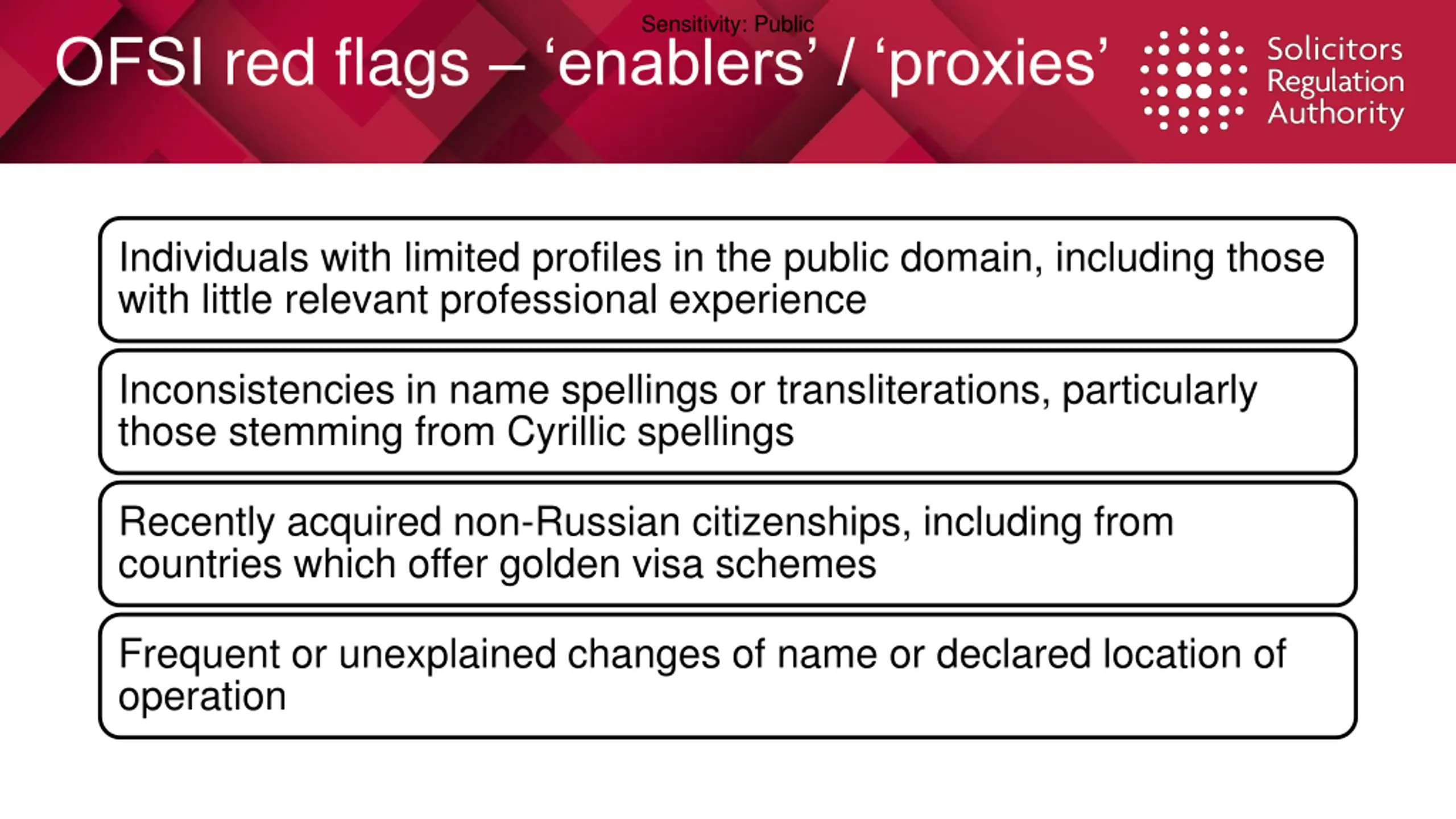 Sensitivity: Public OFSI red flags enablers / proxies Individuals with limited profiles in the public domain, including those with little relevant professional experience Inconsistencies in name spellings or transliterations, particularly those stemming from Cyrillic spellings Recently acquired non-Russian citizenships, including from countries which offer golden visa schemes Frequent or unexplained changes of name or declared location of operation