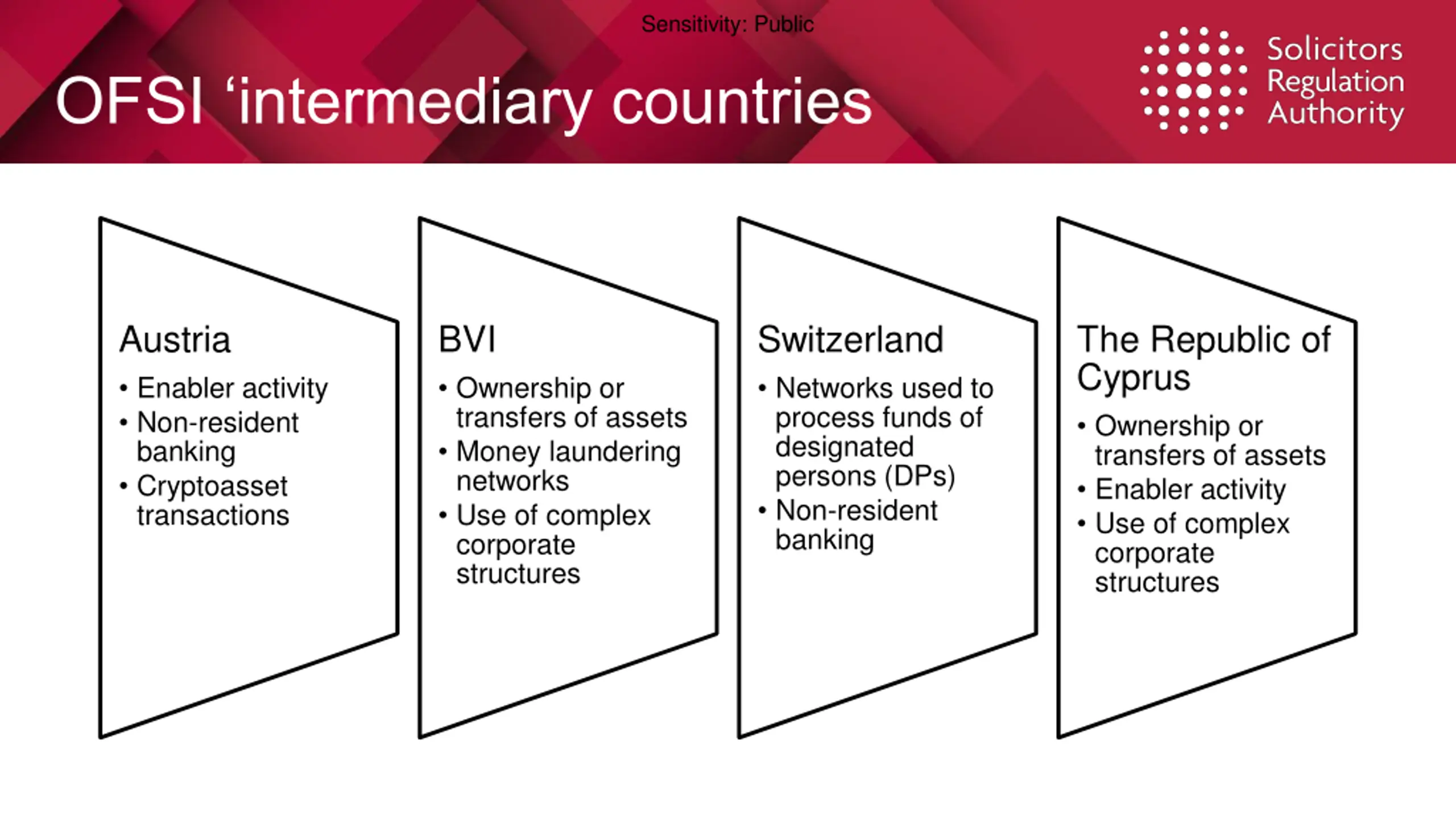 Sensitivity: Public OFSI intermediary countries Austria Enabler activity Non-resident banking Cryptoasset transactions BVI Ownership or transfers of assets Money laundering networks Use of complex corporate structures Switzerland Networks used to process funds of designated persons (DPs) Non-resident banking The Republic of Cyprus Ownership or transfers of assets Enabler activity Use of complex corporate structures