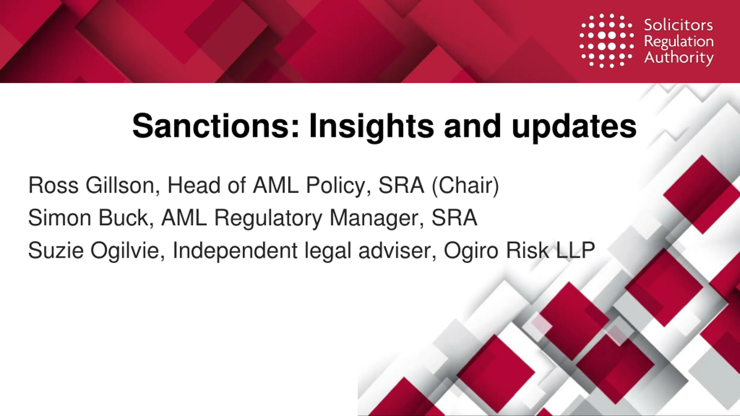 Sensitivity: Public Sanctions: Insights and updates Ross Gillson, Head of AML Policy, SRA (Chair) Simon Buck, AML Regulatory Manager, SRA Suzie Ogilvie, Independent legal adviser, Ogiro Risk LLP