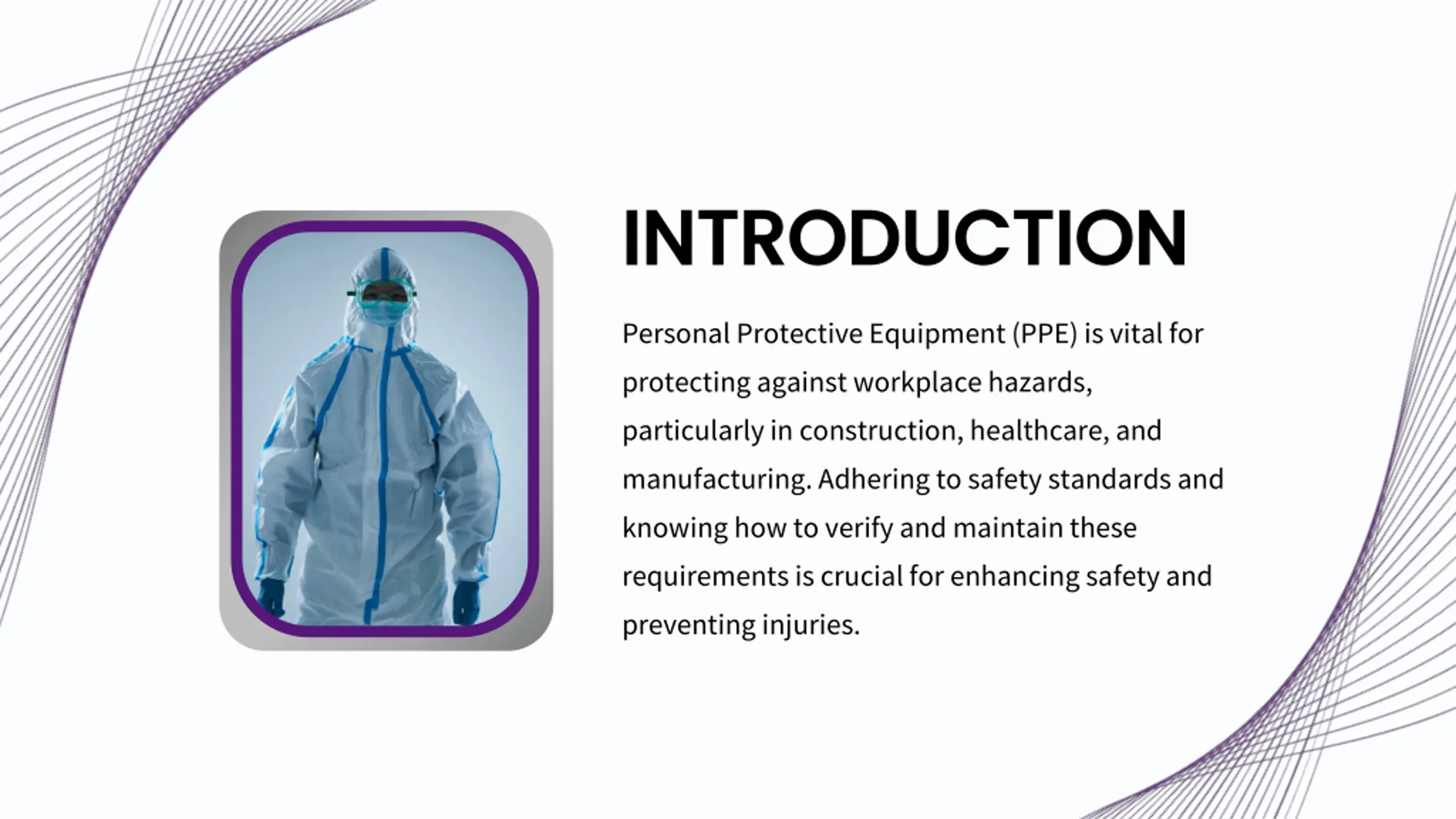 INTRODUCTION INTRODUCTION Personal Protective Equipment (PPE) is vital for protecting against workplace hazards, particularly in construction, healthcare, and manufacturing. Adhering to safety standards and knowing how to verify and maintain these requirements is crucial for enhancing safety and preventing injuries.