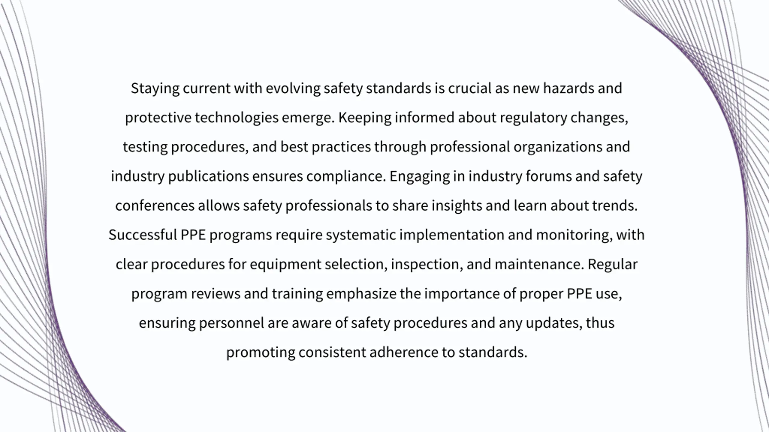Staying current with evolving safety standards is crucial as new hazards and protective technologies emerge. Keeping informed about regulatory changes, testing procedures, and best practices through professional organizations and industry publications ensures compliance. Engaging in industry forums and safety conferences allows safety professionals to share insights and learn about trends. Successful PPE programs require systematic implementation and monitoring, with SERVICE 04 clear procedures for equipment selection, inspection, and maintenance. Regular program reviews and training emphasize the importance of proper PPE use, ensuring personnel are aware of safety procedures and any updates, thus promoting consistent adherence to standards.