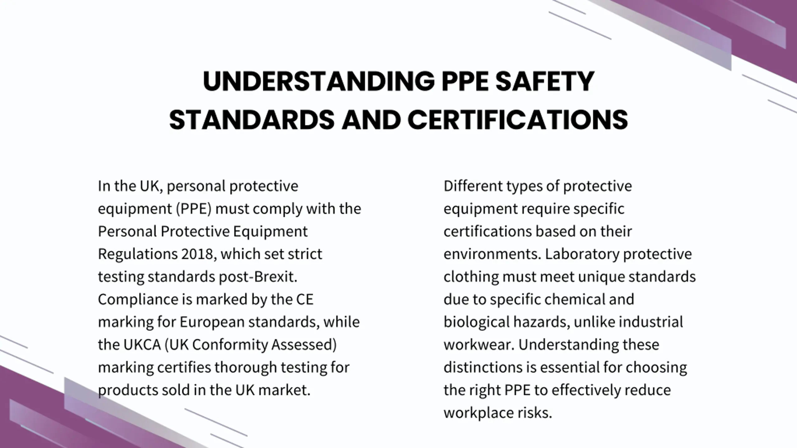 UNDERSTANDING PPE SAFETY STANDARDS AND CERTIFICATIONS In the UK, personal protective equipment (PPE) must comply with the Personal Protective Equipment Regulations 2018, which set strict testing standards post-Brexit. Compliance is marked by the CE marking for European standards, while the UKCA (UK Conformity Assessed) marking certifies thorough testing for products sold in the UK market. Different types of protective equipment require specific certifications based on their environments. Laboratory protective clothing must meet unique standards due to specific chemical and biological hazards, unlike industrial workwear. Understanding these distinctions is essential for choosing the right PPE to effectively reduce workplace risks.
