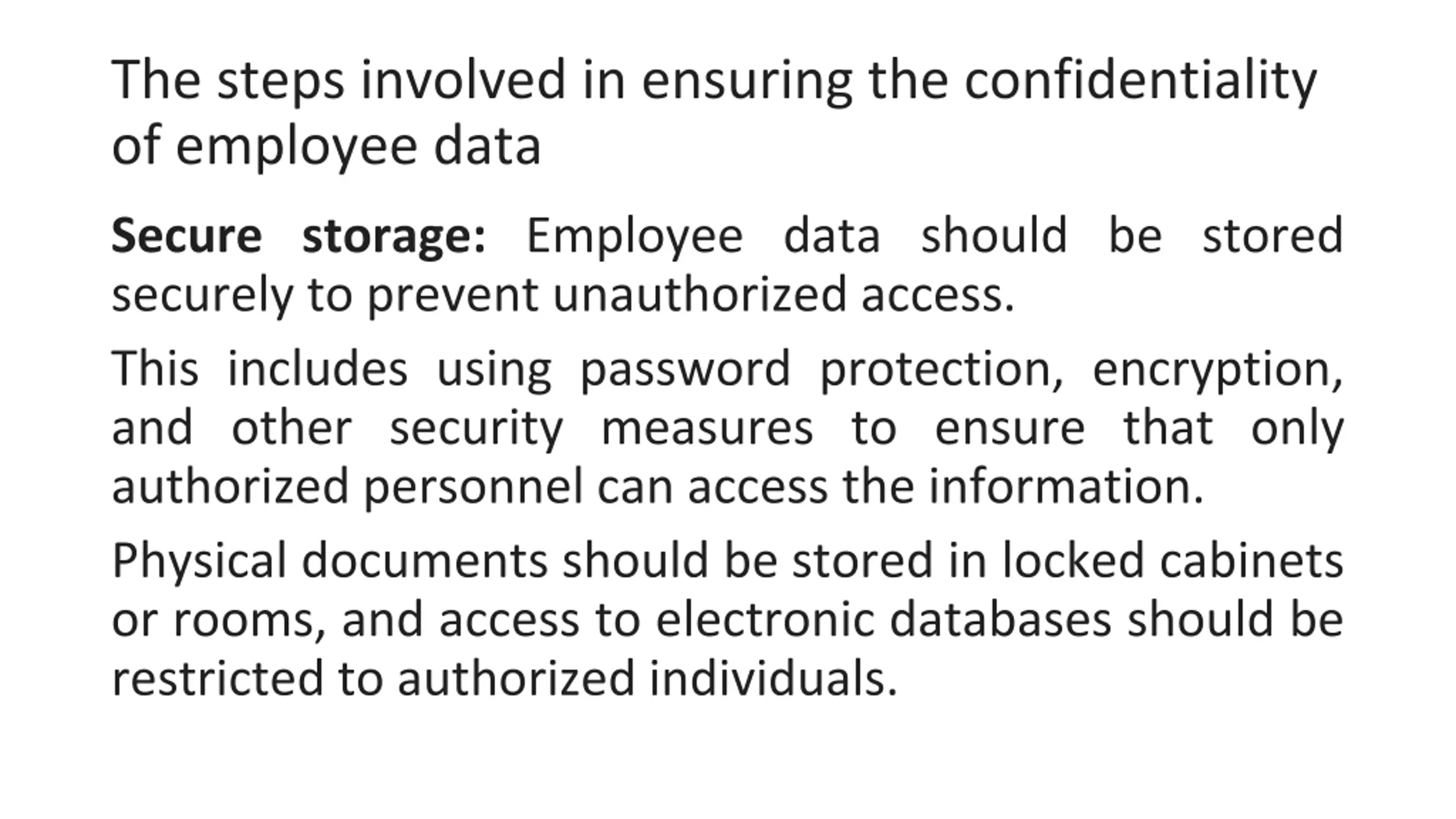 The steps involved in ensuring the confidentiality of employee data Secure storage: Employee data should be stored securely to prevent unauthorized access. This includes using password protection, encryption, and other security measures to ensure that only authorized personnel can access the information. Physical documents should be stored in locked cabinets or rooms, and access to electronic databases should be restricted to authorized individuals.