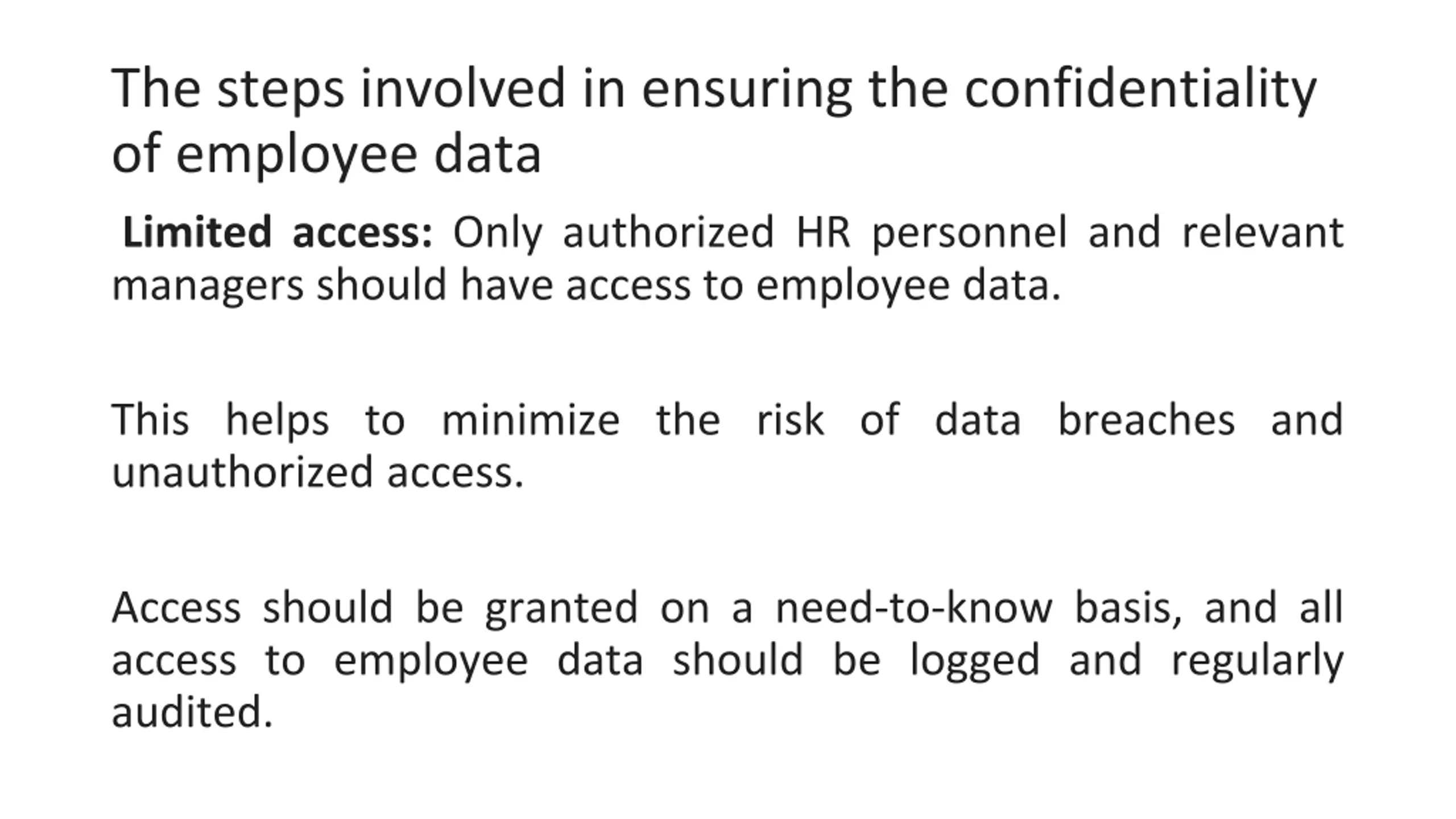 The steps involved in ensuring the confidentiality of employee data Limited access: Only authorized HR personnel and relevant managers should have access to employee data. This helps to minimize the risk of data breaches and unauthorized access. Access should be granted on a need-to-know basis, and all access to employee data should be logged and regularly audited.