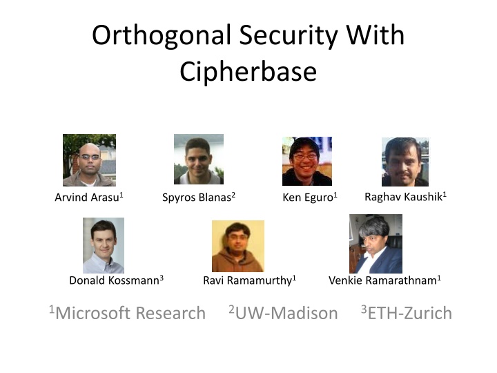 Orthogonal Security With Cipherbase Raghav Kaushik1 Arvind Arasu1 Spyros Blanas2 Ken Eguro1 Donald Kossmann3 Ravi Ramamurthy1 Venkie Ramarathnam1 1Microsoft Research 2UW-Madison 3ETH-Zurich