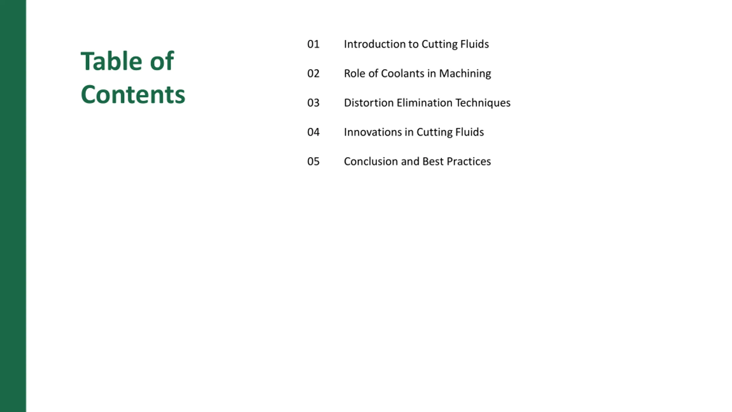 01 Introduction to Cutting Fluids Table of Contents 02 Role of Coolants in Machining 03 Distortion Elimination Techniques 04 Innovations in Cutting Fluids 05 Conclusion and Best Practices