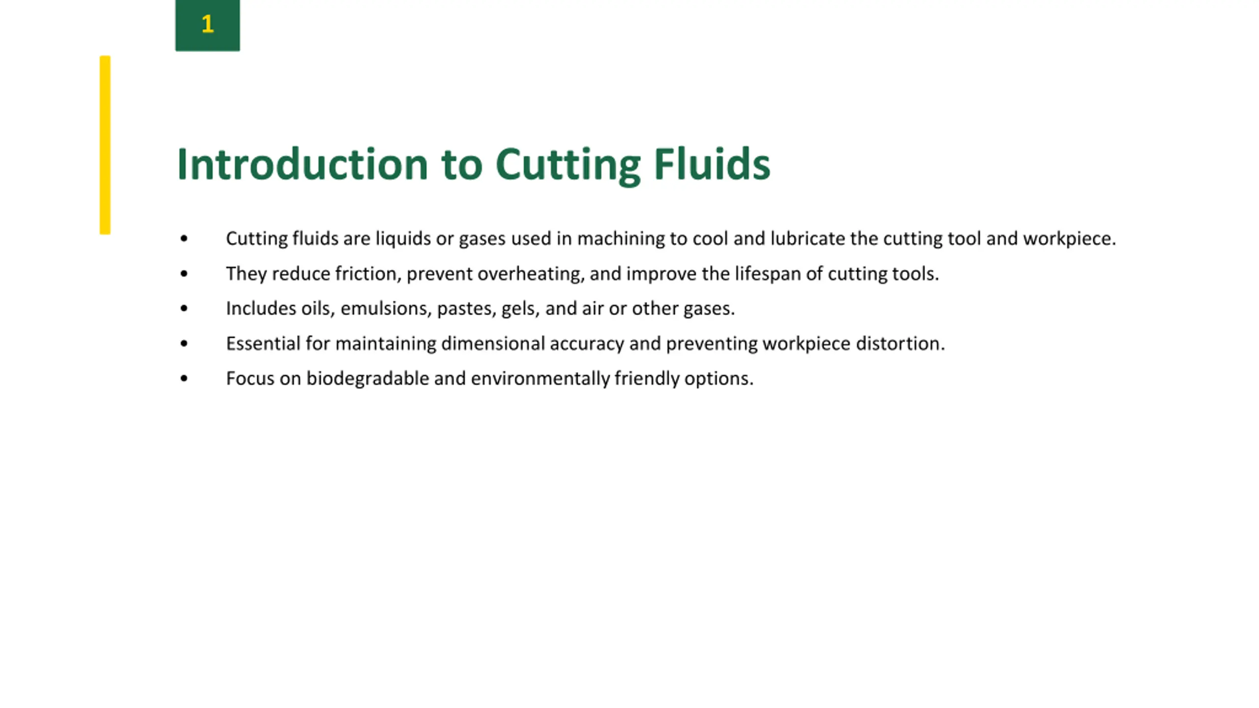 1 Introduction to Cutting Fluids Cutting fluids are liquids or gases used in machining to cool and lubricate the cutting tool and workpiece. They reduce friction, prevent overheating,and improve the lifespan of cutting tools. Includes oils, emulsions, pastes, gels, and air or other gases. Essential for maintaining dimensional accuracy and preventingworkpiece distortion. Focus on biodegradable and environmentally friendlyoptions.