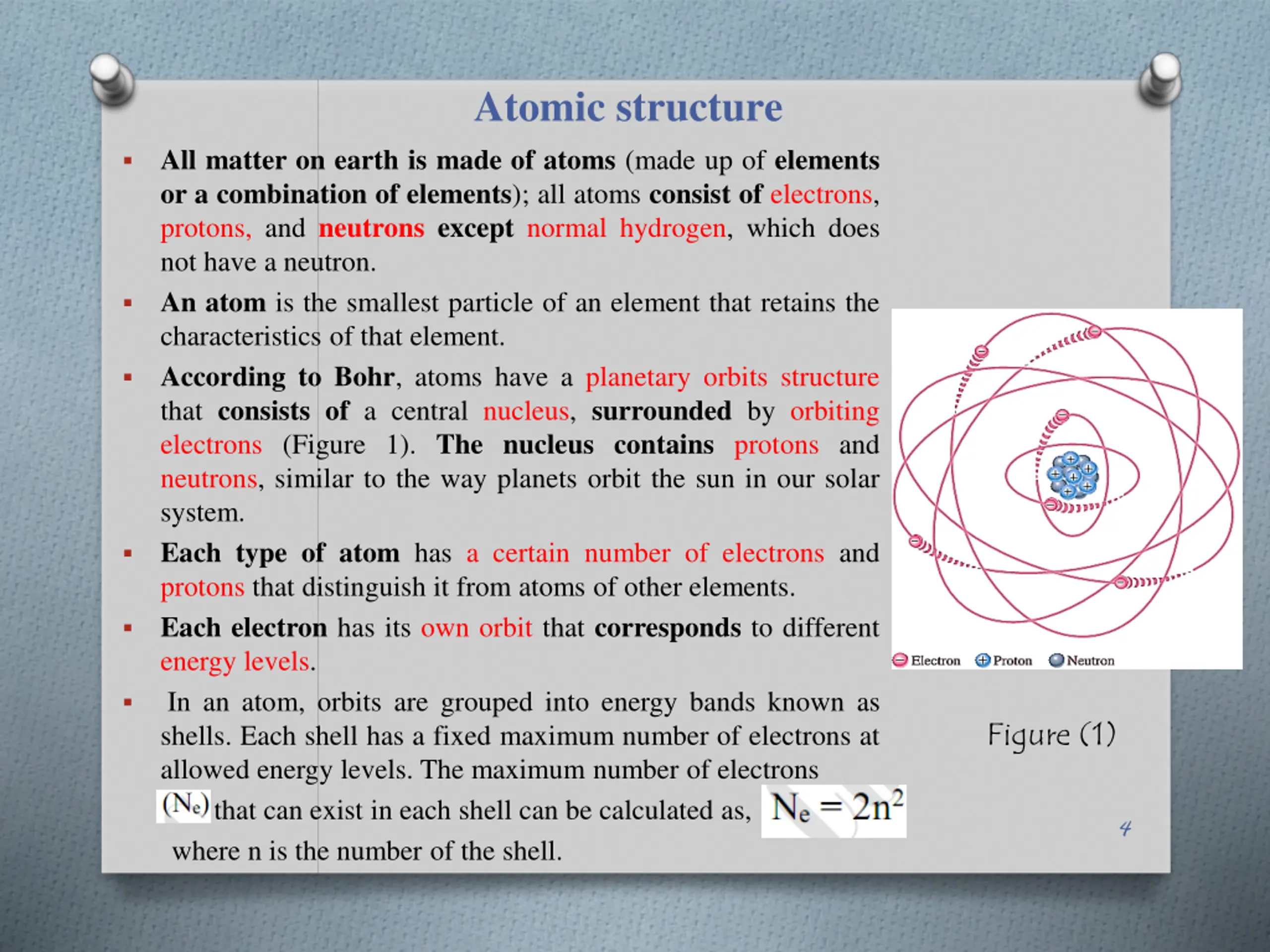 Atomic structure All matter on earth is made of atoms (made up of elements or a combination of elements); all atoms consist of electrons, protons, and neutronsexcept normal hydrogen, which does not have a neutron. An atom is the smallest particle of an element that retains the characteristics of that element. According to Bohr, atoms have a planetary orbits structure that consists of a central nucleus, surrounded by orbiting electrons (Figure 1). The nucleus contains protons and neutrons, similar to the way planets orbit the sun in our solar system. Each type of atom has a certain number of electrons and protons that distinguish it from atoms of other elements. Each electron has its own orbit that corresponds to different energy levels. In an atom, orbits are grouped into energy bands known as shells. Each shell has a fixed maximum number of electrons at allowed energy levels. The maximum number of electrons that can exist in each shell can be calculated as, where n is the number of the shell. Figure (1) 4