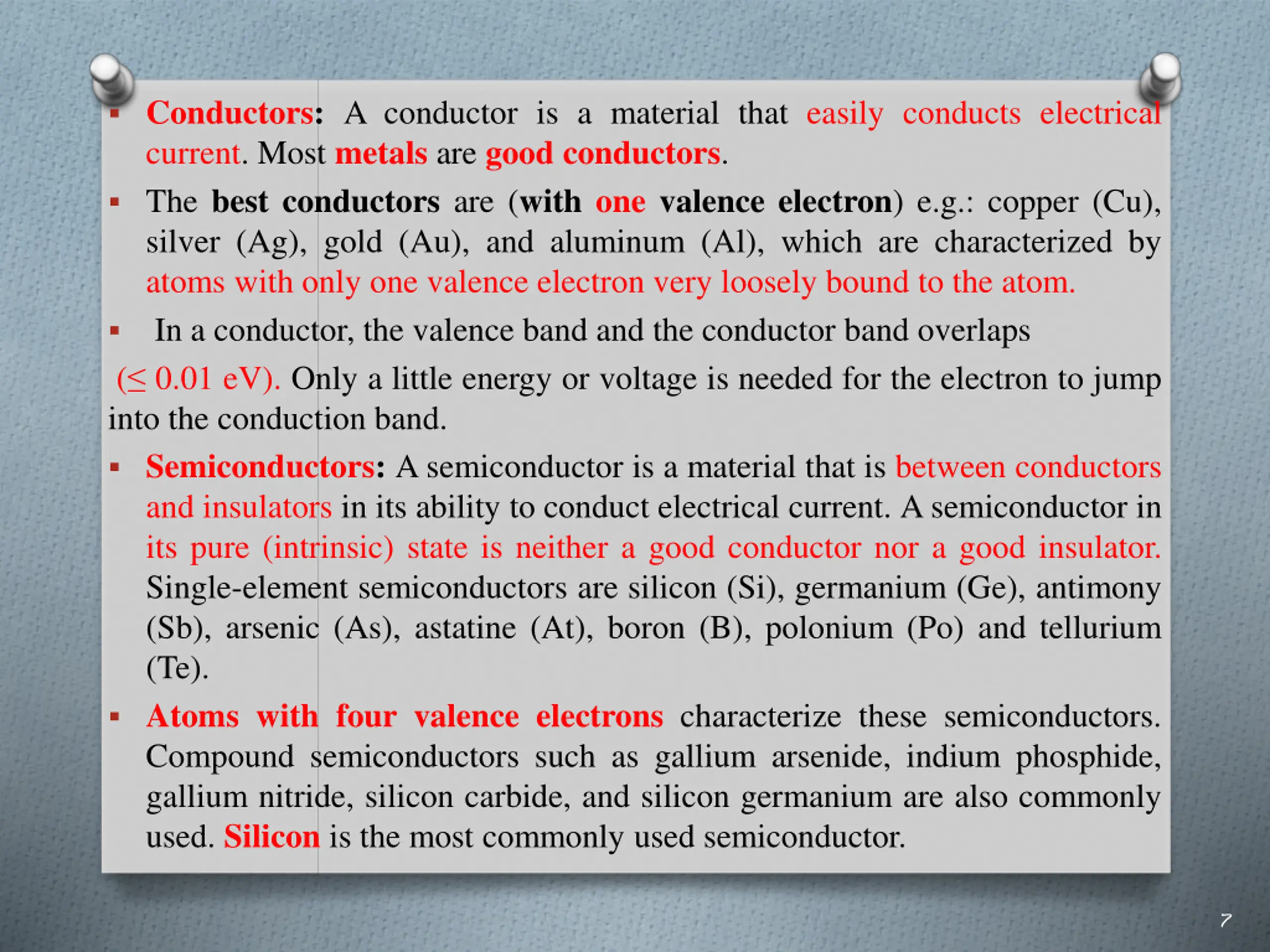 Conductors: A conductoris a material that easily conducts electrical current. Most metals are good conductors. The best conductors are (with one valence electron) e.g.: copper (Cu), silver (Ag), gold (Au), and aluminum (Al), which are characterized by atoms with only one valence electron very loosely bound to the atom. In a conductor, the valence band and the conductor band overlaps ( 0.01 eV). Only a little energy or voltage is needed for the electron to jump into the conduction band. Semiconductors: A semiconductor is a material that is between conductors and insulators in its ability to conduct electrical current. A semiconductor in its pure (intrinsic) state is neither a good conductor nor a good insulator. Single-element semiconductors are silicon (Si), germanium (Ge), antimony (Sb), arsenic (As), astatine (At), boron (B), polonium (Po) and tellurium (Te). Atoms with four valence electrons characterize these semiconductors. Compound semiconductors such as gallium arsenide, indium phosphide, gallium nitride, silicon carbide, and silicon germanium are also commonly used. Silicon is the most commonly used semiconductor. 7