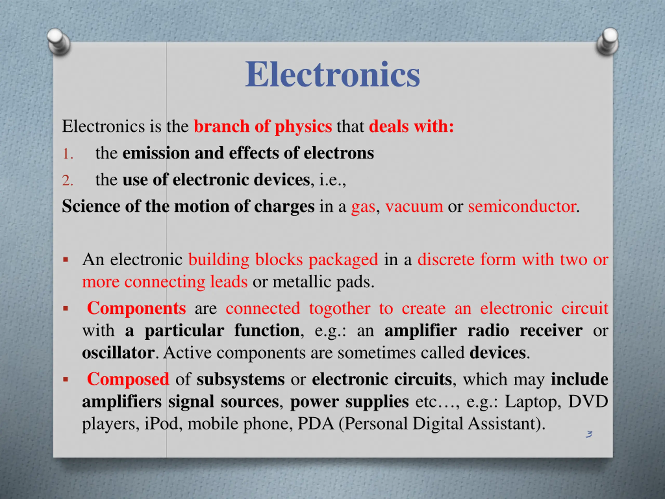 Electronics Electronics isthe branch of physics that deals with: the emission and effects of electrons the use of electronic devices, i.e., Science of the motion of charges in a gas, vacuum or semiconductor. 1. 2. An electronic building blocks packaged in a discrete form with two or more connecting leads or metallic pads. Components are connected togother to create an electronic circuit with a particular function, e.g.: an amplifierradioreceiver or oscillator. Active components are sometimes called devices. Composed of subsystems or electronic circuits, which may include amplifiers signal sources, power supplies etc , e.g.: Laptop, DVD players, iPod, mobile phone, PDA (Personal Digital Assistant). 3